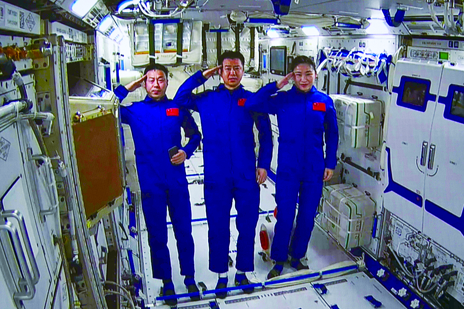 7月25日在北京航天飞行控制中心拍摄的神舟十四号航天员乘组进入问天实验舱。航天员陈冬(中)、刘洋(右)、蔡旭哲进入问天实验舱。新华社记者 郭中正 摄