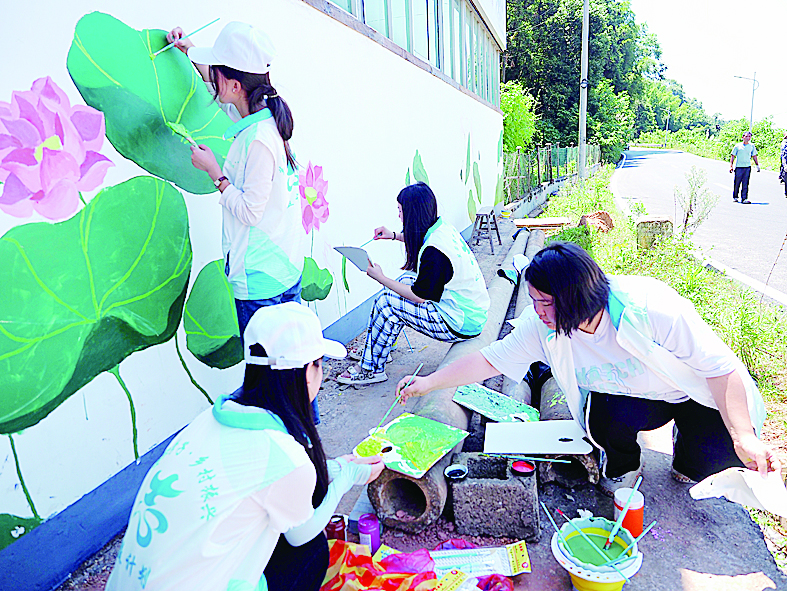 “工大好青年”团队在三门镇设计墙绘。 株洲日报全媒体记者/杨如 摄
