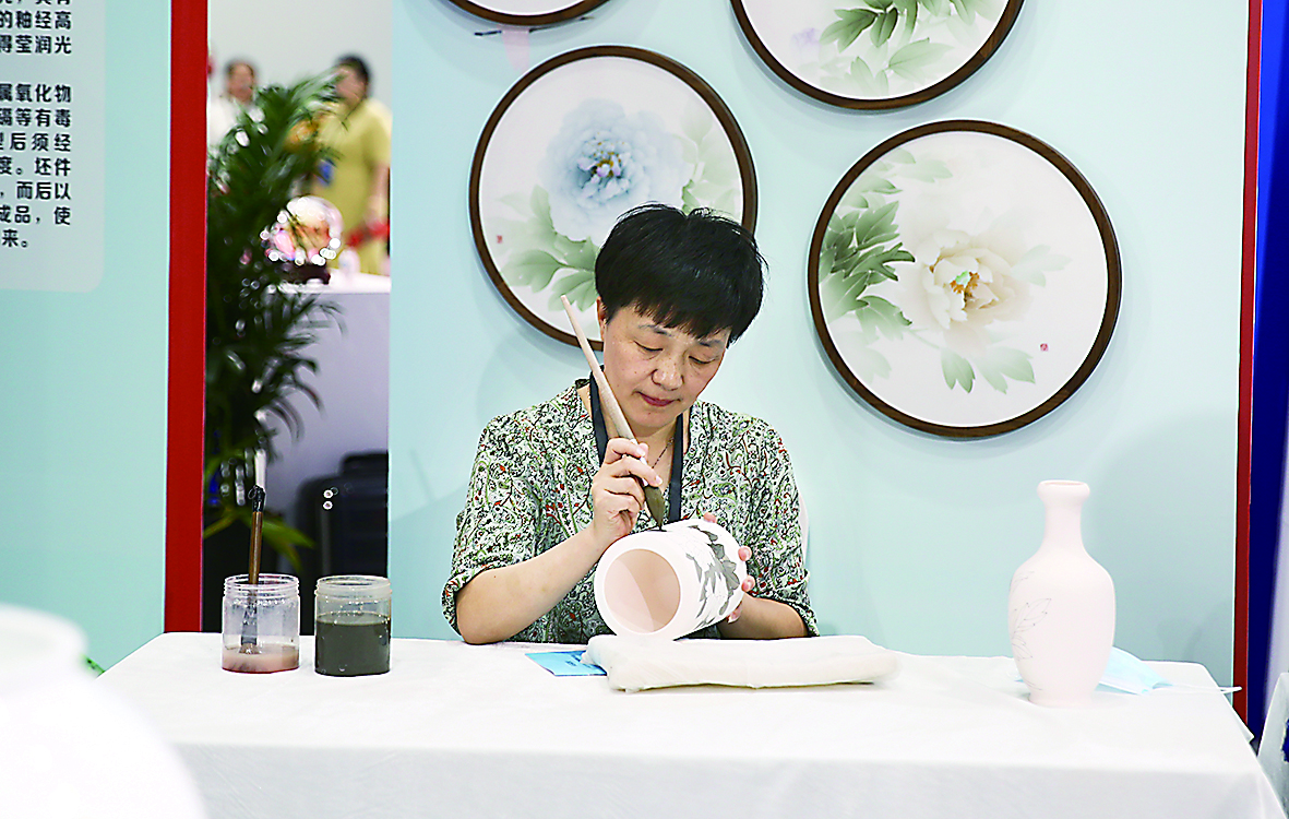 陈利在展览现场专注绘制陶瓷画作。 受访者 供图