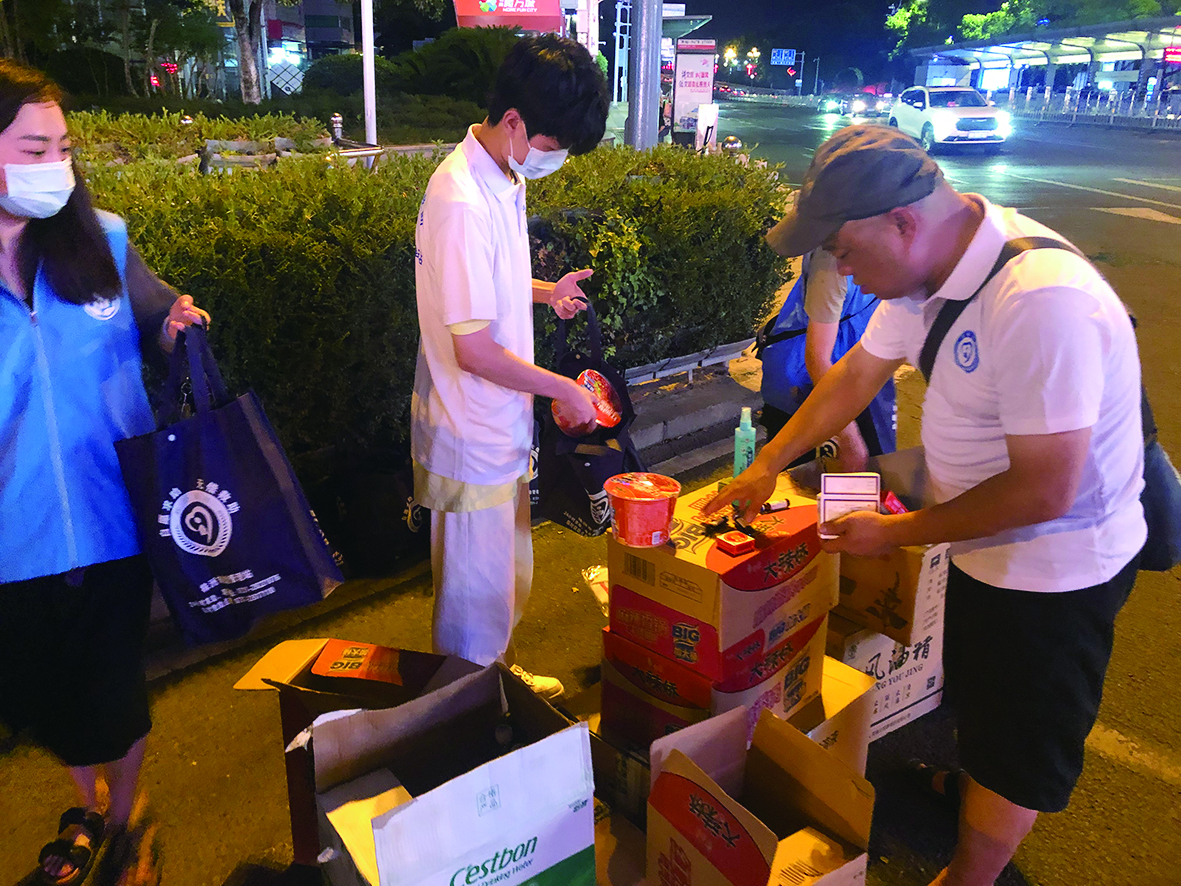 市救助管理站工作人员在中心广场为街头生活无着人员发放防暑防疫物资和食物。 通讯员/供图