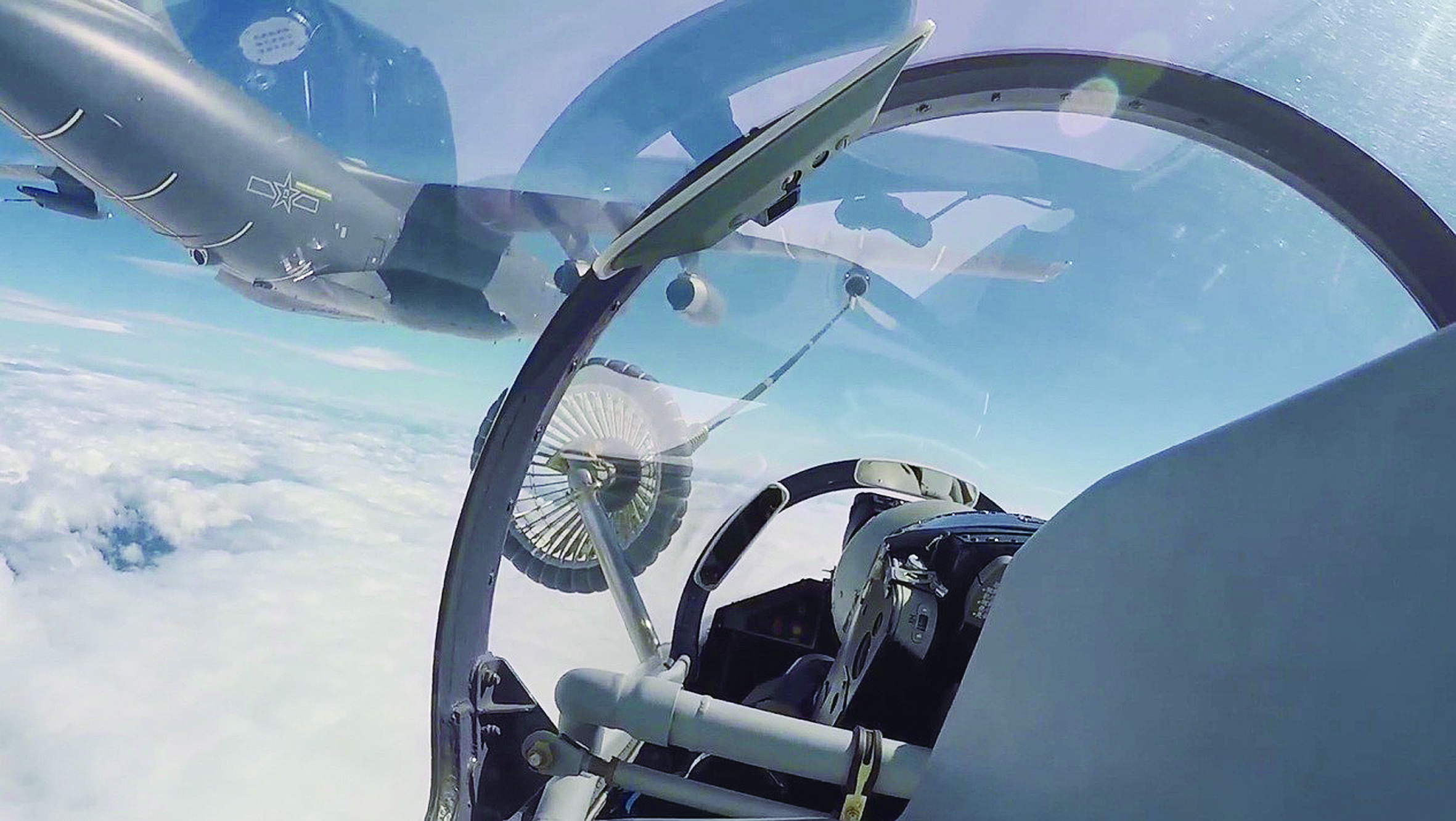 8月4日,东部战区空军航空兵某旅同时出动多架战机,飞赴台岛周边海域执行任务。这是战机进行空中加油(视频截图)。新华社发