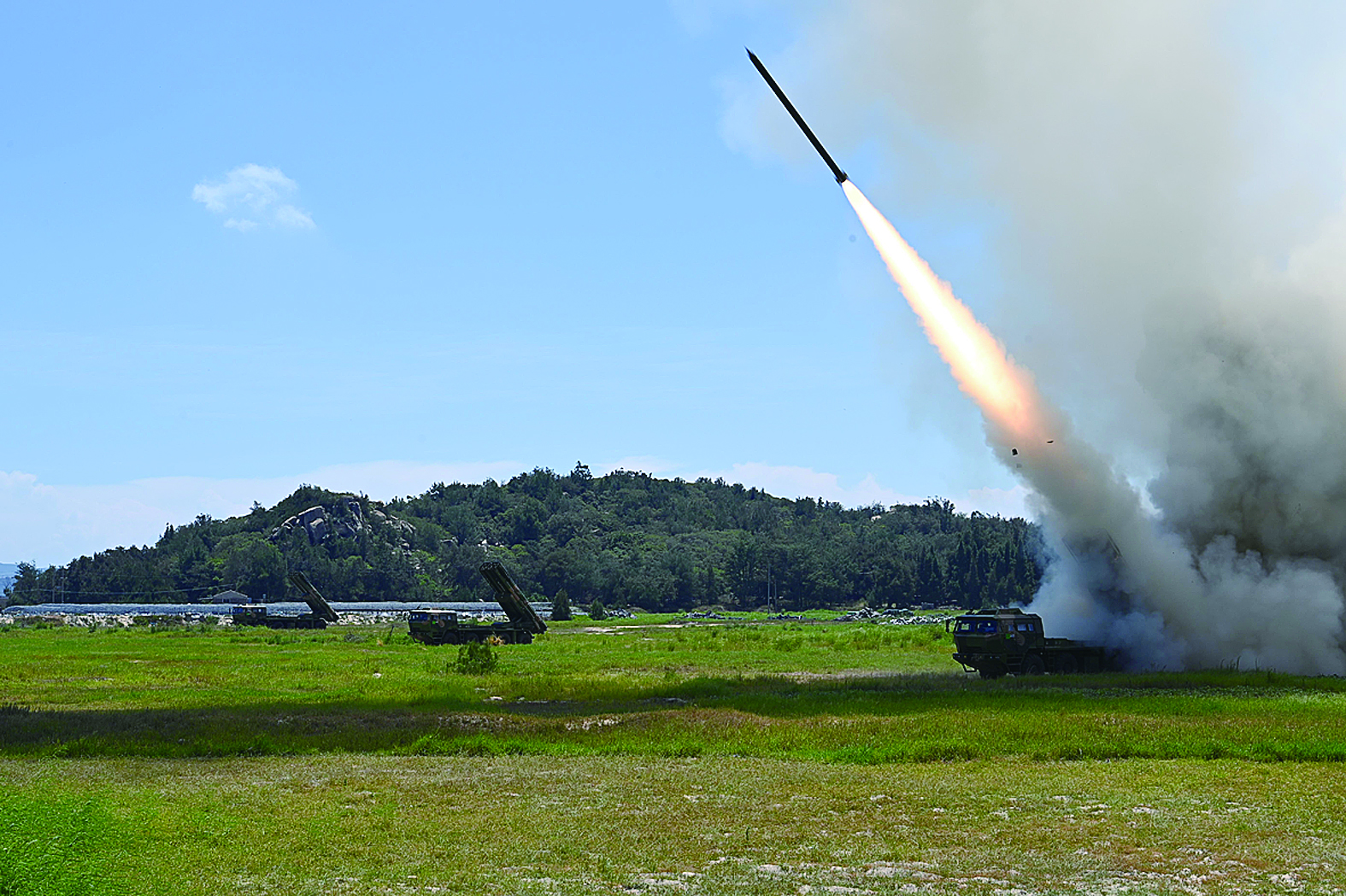 8月4日,东部战区陆军某旅组织远火分队在台湾海峡组织实弹射击,完成精确打击任务。这是发射现场。新华社发