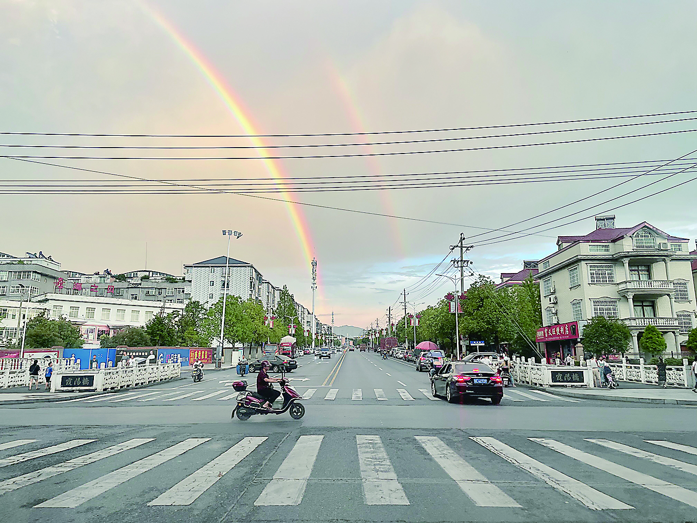8月7日19时许,一场风雨之后,炎陵县城上空突现两道美丽彩虹,横跨天宇,十分壮观。其整齐排列,一高一低、一长一短、一艳一淡,把山城炎陵装扮得愈发美丽,引得路人纷纷驻足观看、拍照。