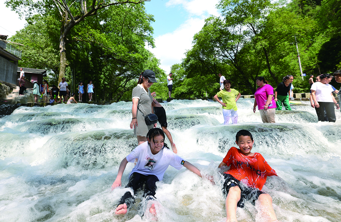 8月8日,湖南省怀化市通道侗族自治县万佛山镇木脚村,人们在坝间戏水。