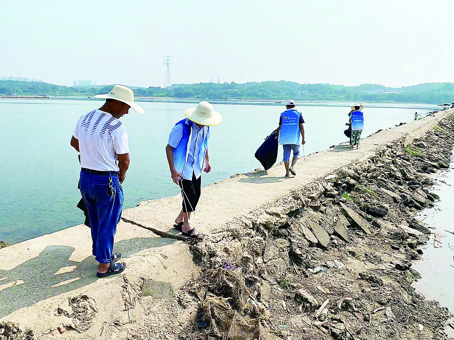 群丰镇党员干部、志愿者化身“水域美容师”,用汗水守护碧波。 株洲日报全媒体记者/杨如 摄