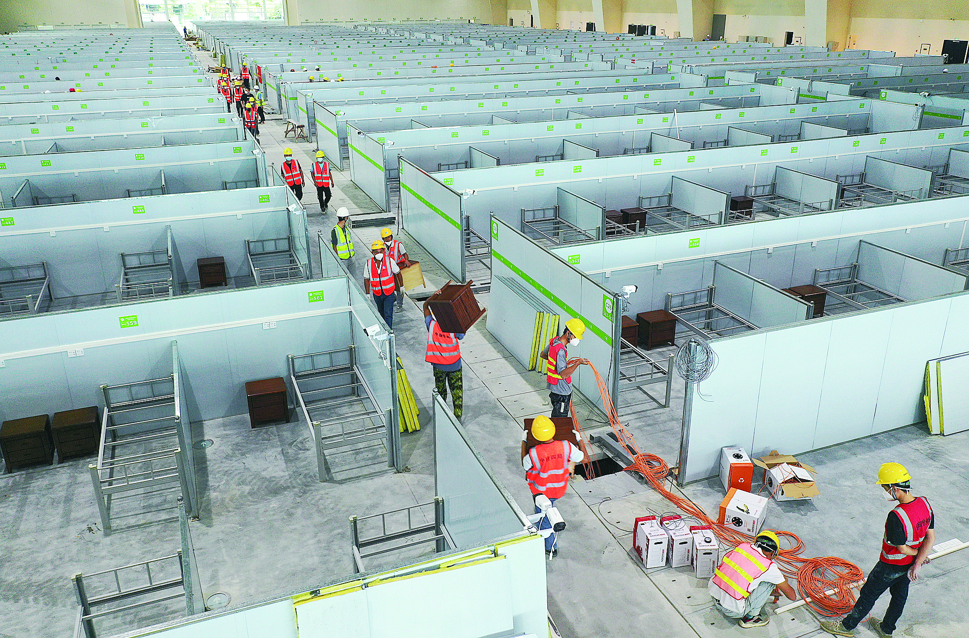 8月10日,工人在三亚第二方舱医院作业(无人机照片)。新华社发