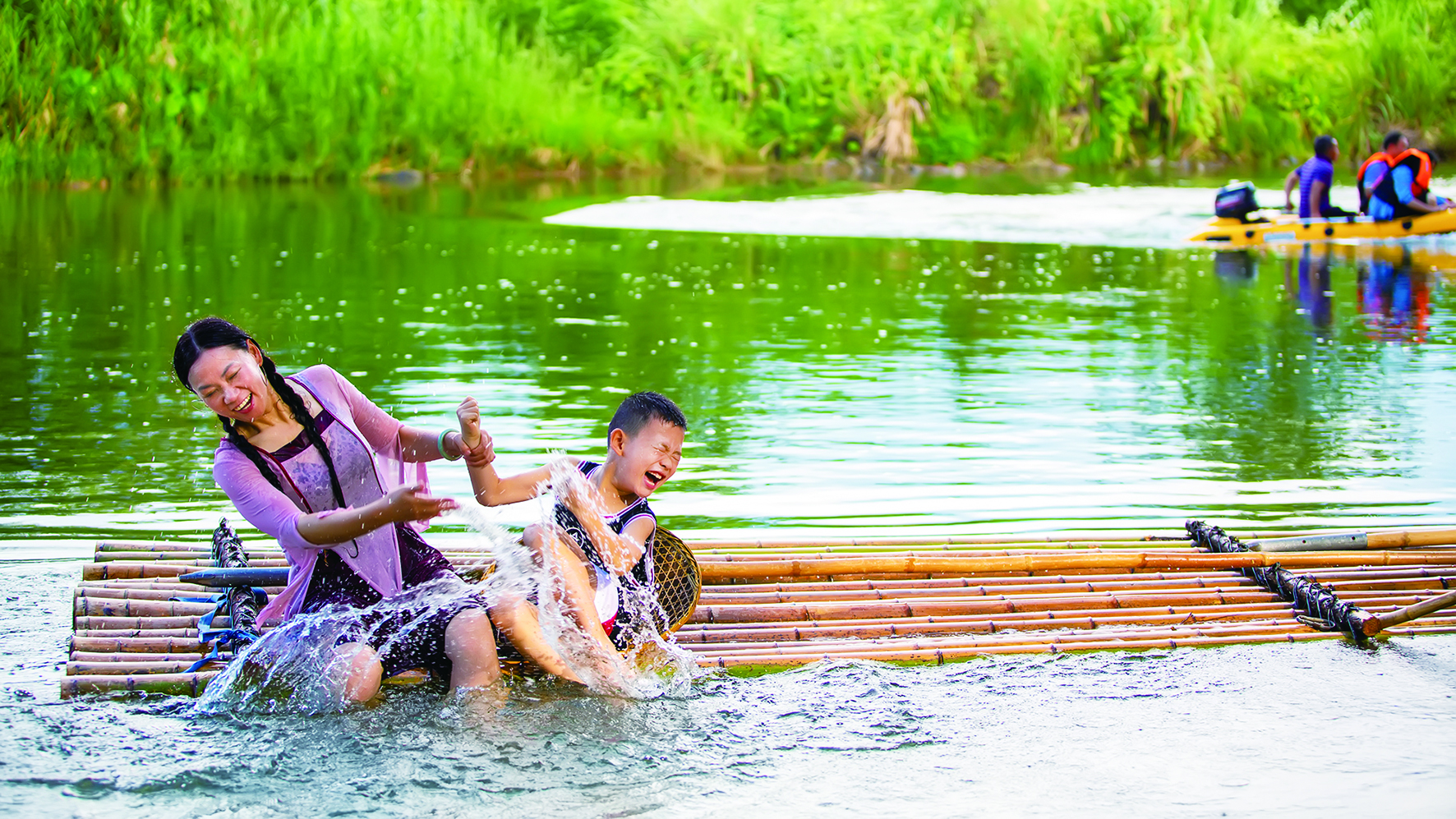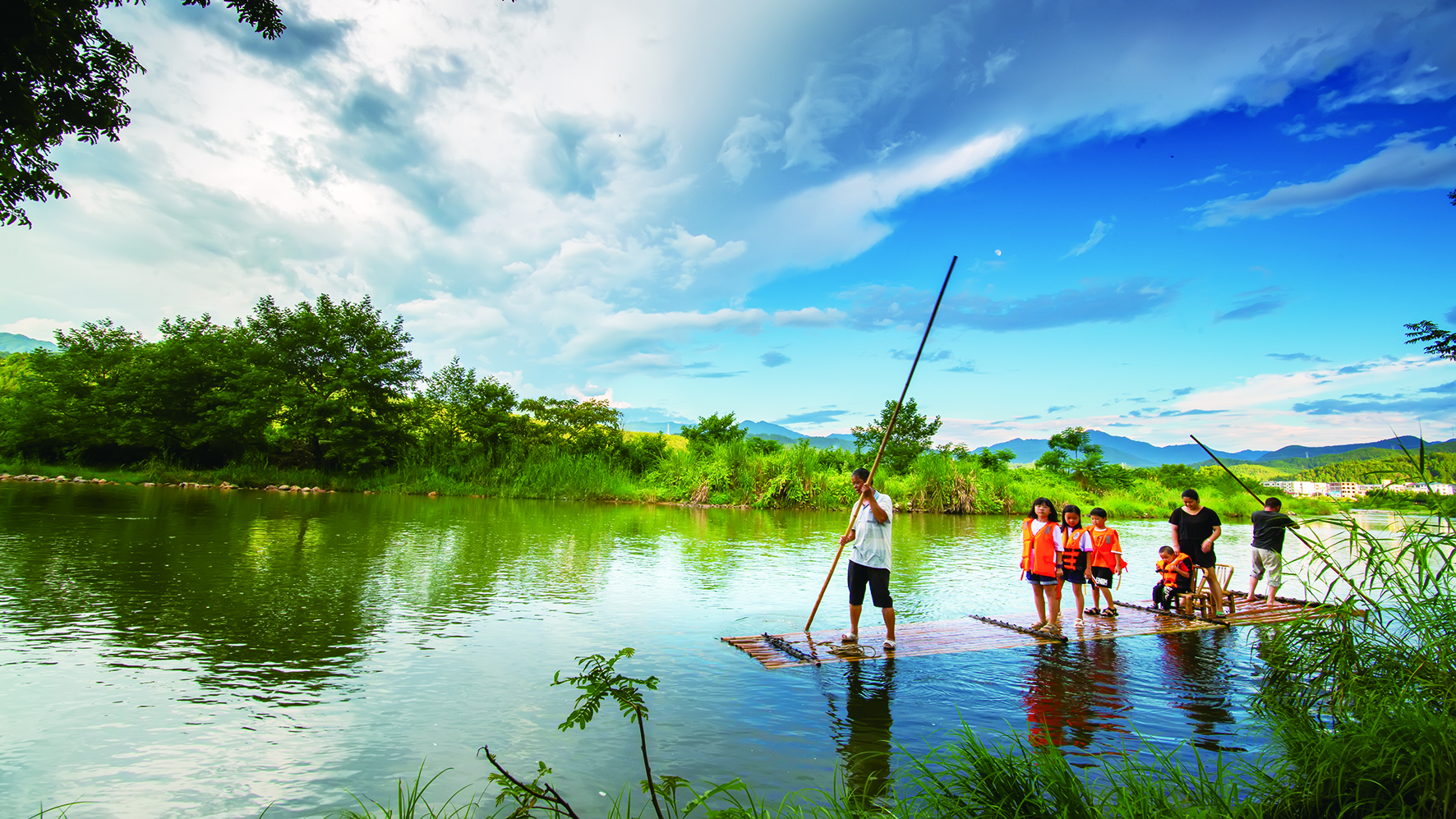 游客乘坐竹筏,泛游洣水。