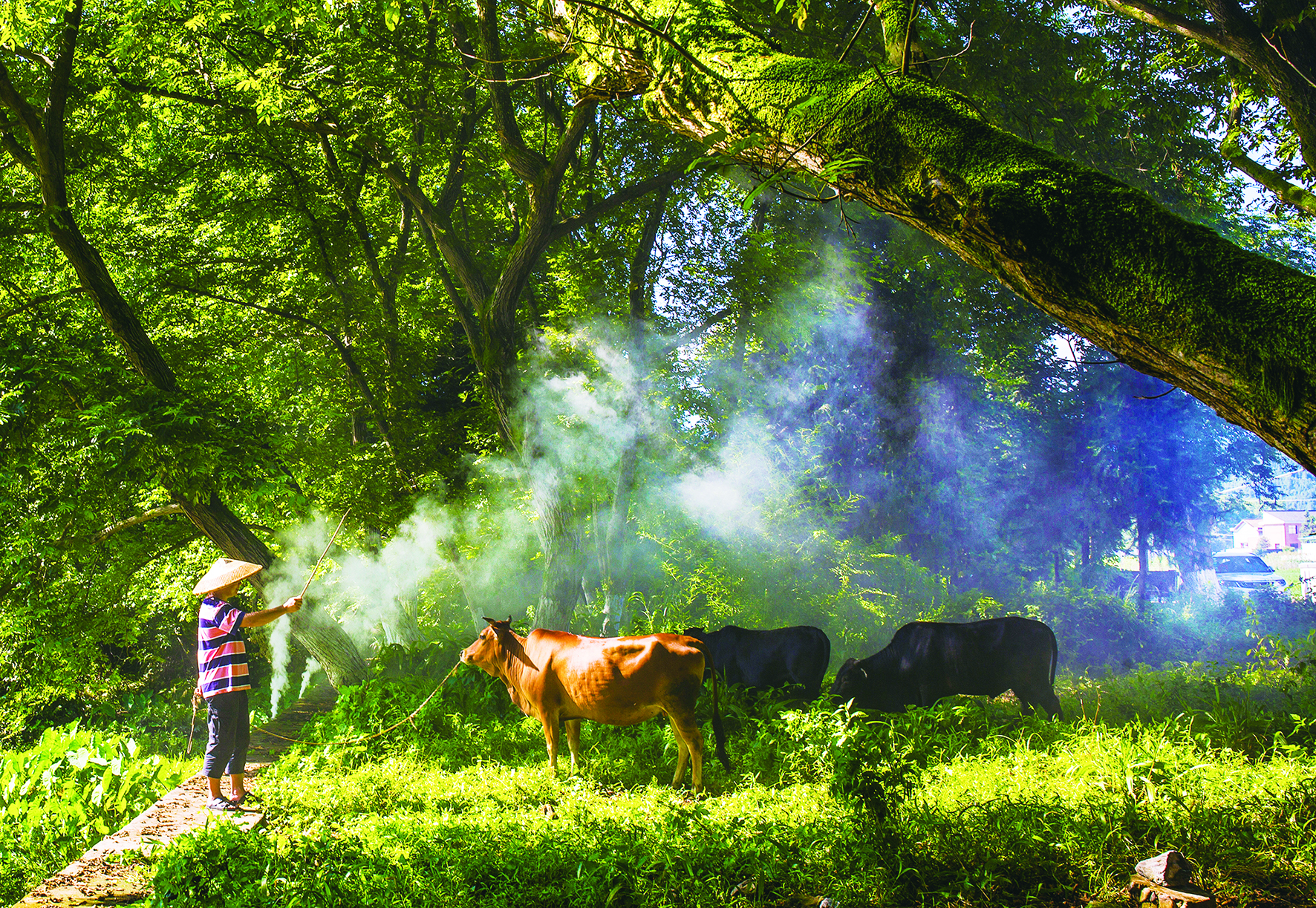 人工营造牧牛氛围。