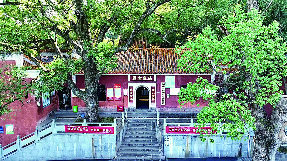 进入仙庾主景区,沿着主道而上,不一会儿便来到半山腰,绿树掩映中,一幢古色古香的庙宇式建筑跃然于前,随之还有沁人的香火味,以及若有若无的乐声飘来,乐声是道教的“澄清韵”。