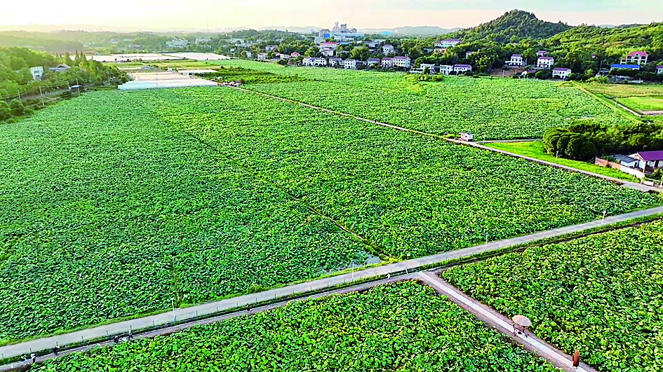 偌大的荷塘公路环绕、绿树成荫,红白相间的村落点缀其间。来到一块荷花开得正旺的荷塘,只见层层叠叠的翠绿色荷叶中,盛开的粉红色的荷花亭亭玉立,那白里透红的花瓣、粉黄色的花,展现着婀娜之美,还吸引了色彩各异的蜻蜓飞落花蕊或荷叶上。