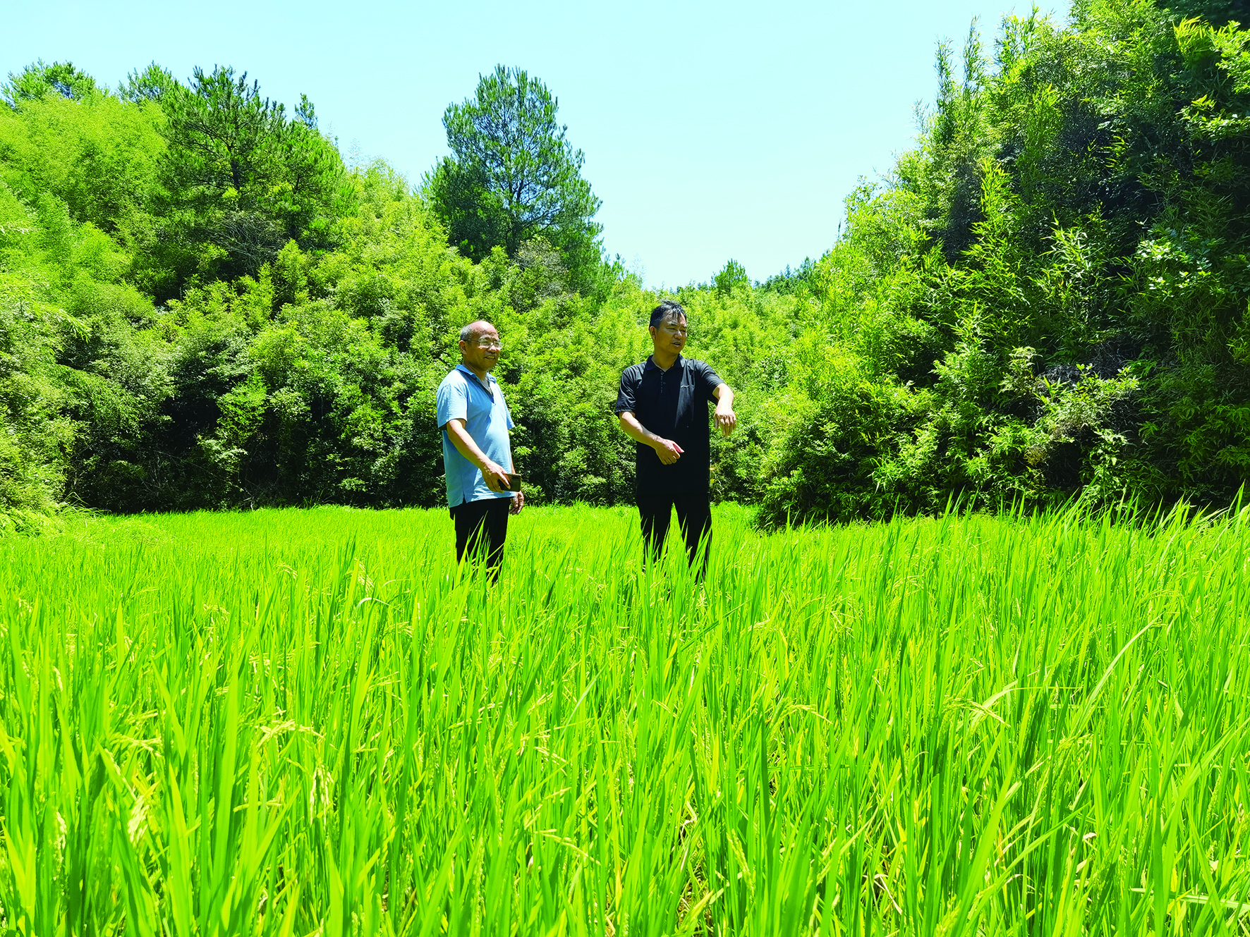 刘分粮(右)与欧阳春晖(左)察看山冲间水稻长势。 株洲日报全媒体记者/陈驰 摄