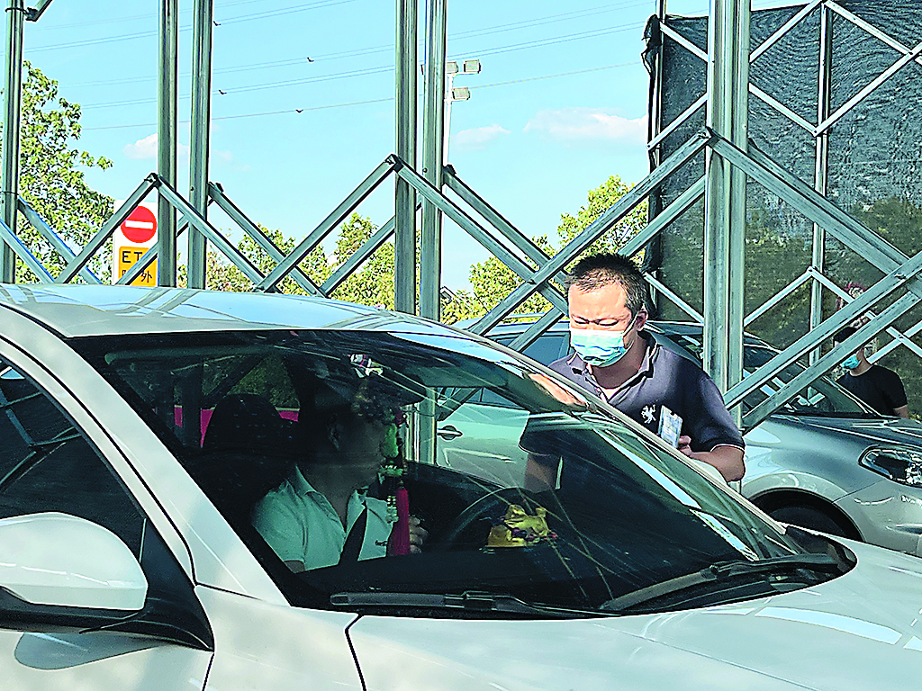 此时,气温高达39℃。虽然是站在遮阳棚下,但上岗仅几分钟,豆大的汗珠,就顺着他的额头流下,不一会就全身湿透。“逢车必检,查验健康码、行程卡、核酸检测证明,外省返株人员还必须现场进行核酸检测,不漏一车一人,不放过任何一个细节。”田肸抽空用毛巾擦了一把汗,又继续走向下一台车辆。从今年3月中旬到现在,除中间疫情平稳时刻外,他已在此值守多月,和同事们一起,负责高速出口车辆司乘人员的健康监测和排查。尤其是7月以来,长时间高温酷暑,每天高速出口车辆高达6000台,工作强度可想而知。2020年和2021年两次疫情期间,他也作为防控队员,在此连续值守几个月。