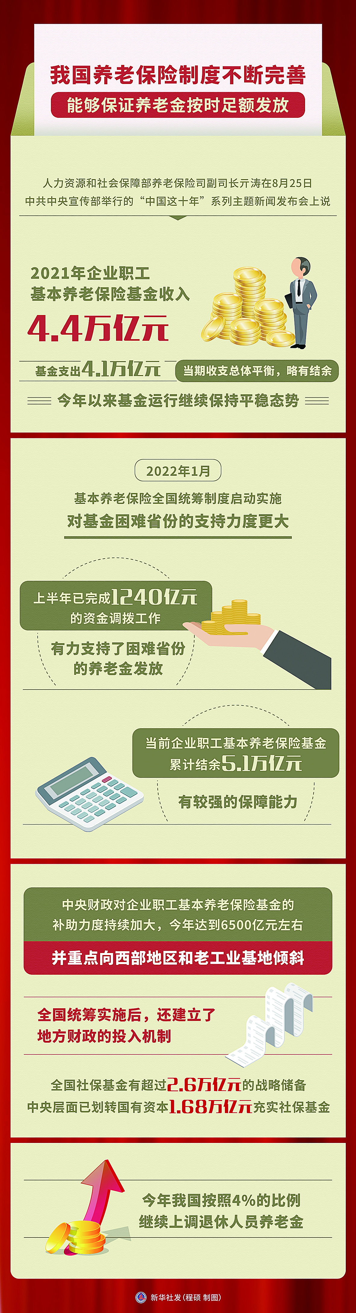 中共中央宣传部8月25日举行“中国这十年”系列主题新闻发布会,人社部有关负责人表示,今年尽管经济下行叠加疫情影响,但我国仍按照4%的比例调整退休人员养老金,目前增发的养老金已发放到位。