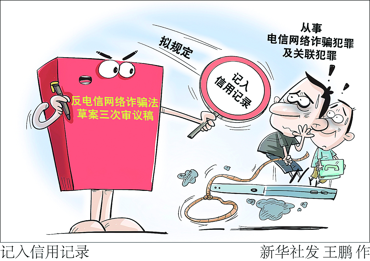新华社北京8月26日电 记者26日从全国人大常委会法制工作委员会发言人记者会获悉,即将提请全国人大常委会会议审议的反电信网络诈骗法草案三次审议稿拟规定,对从事电信网络诈骗犯罪及关联犯罪的人员,可以按照国家有关规定记入信用记录,并采取相应的惩戒措施。