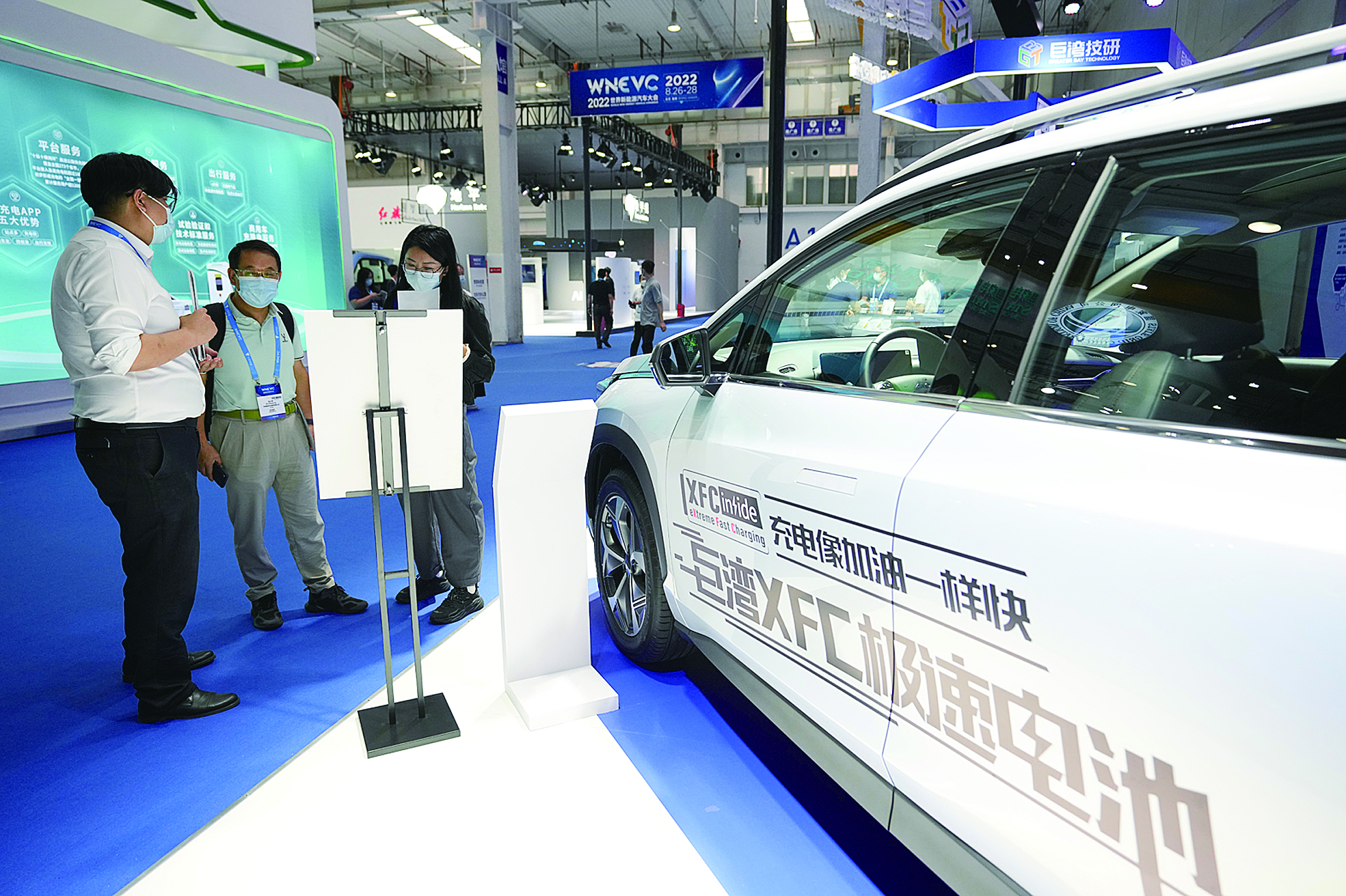 8月26日,工作人员向参观者介绍一款搭载可快速充电电池的新能源汽车。