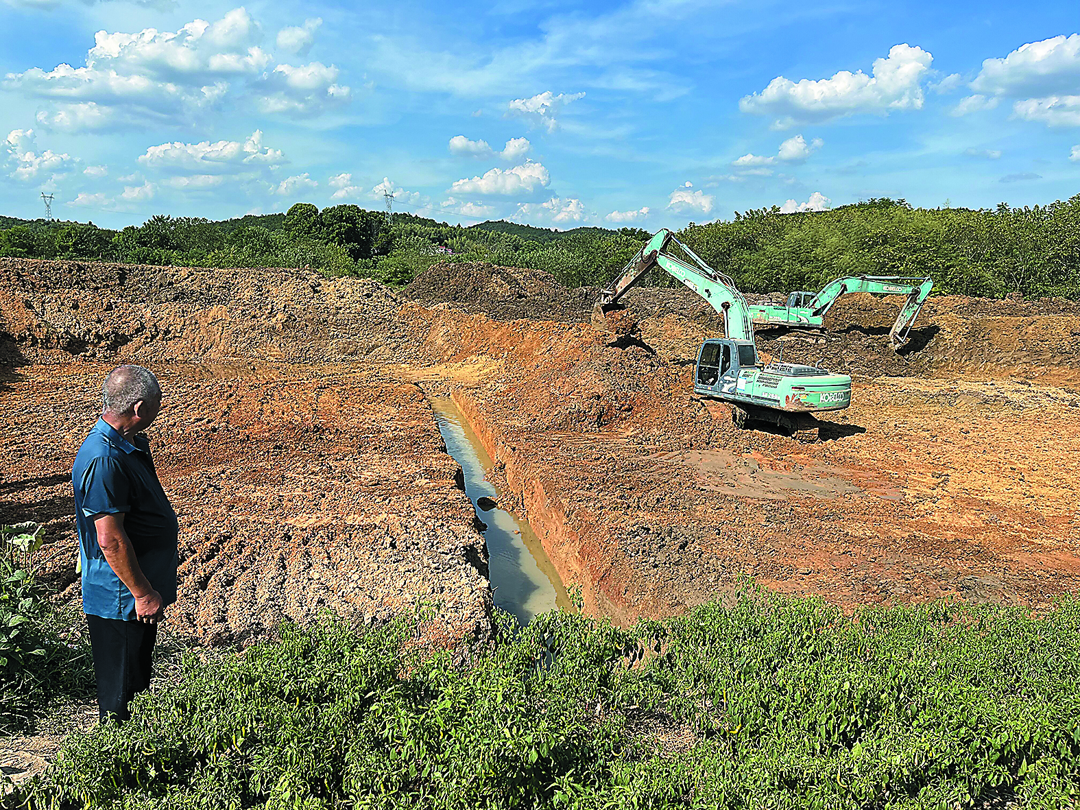 8月27日,两辆挖掘机在挖蓄水塘。 株洲日报全媒体记者/刘平 摄
