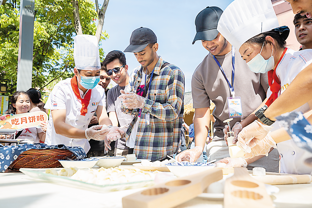 9月10日,方特梦幻王国里,30余名留学生在糕点师的指导下,动手制作月饼、柚子灯,感受中秋节的欢乐气氛。