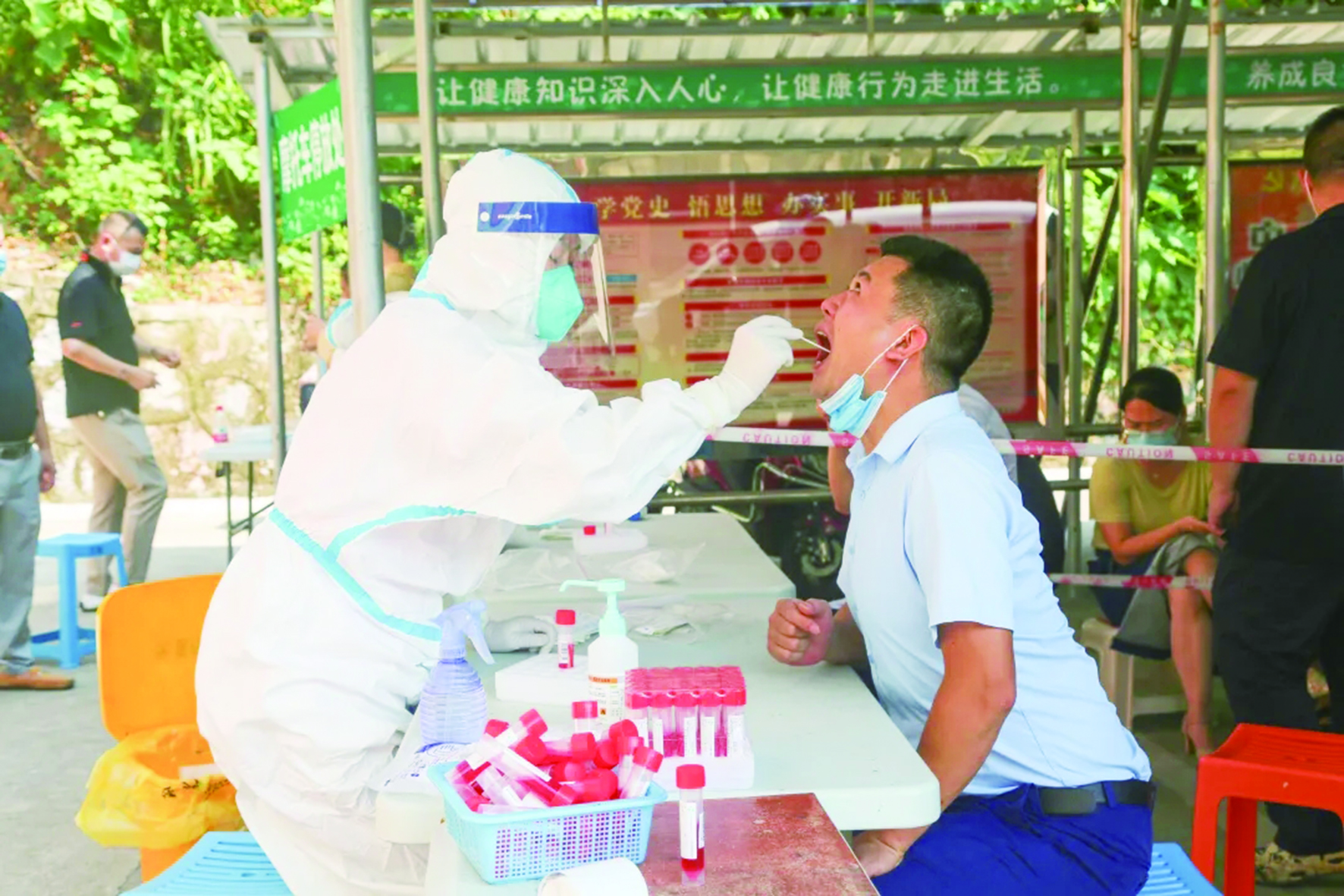 9月14日早晨8点30分,芦淞区率先开启常态化疫情防控下新一轮核酸采样工作。接到通知的居民们纷纷来到就近采样点,有序接受核酸采样。9月14日至16日,全区共有28个核酸采样点可为居民提供服务。截至9月14日17时30分,全区共采集核酸样本51444份。图为芦淞区居民在庆云街道社区卫生服务中心进行核酸采样。
