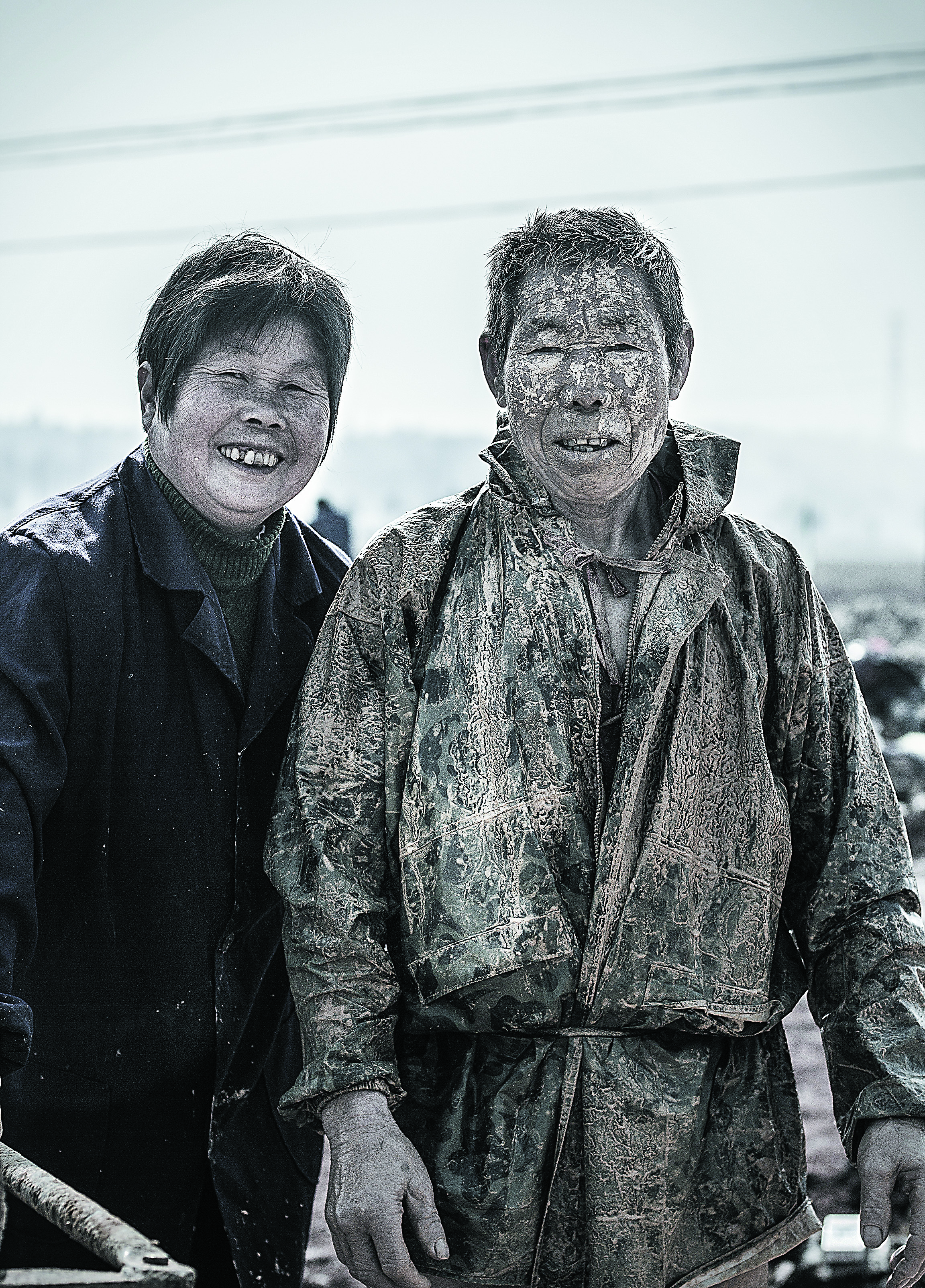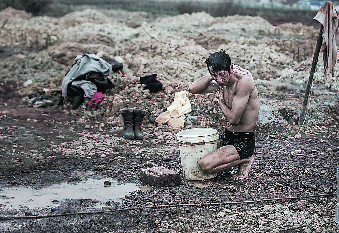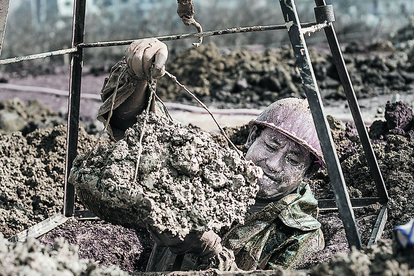 拍了几次后老觉得照片还差了点什么,后来得摄影老师指点,要我去更多地了解他们的生活,于是我利用他们中餐的时间,请他们把我吊下去感受,还跟着他们回到家里。几天的拍摄,我也成为了泥人,感受到了他们的生活不易。