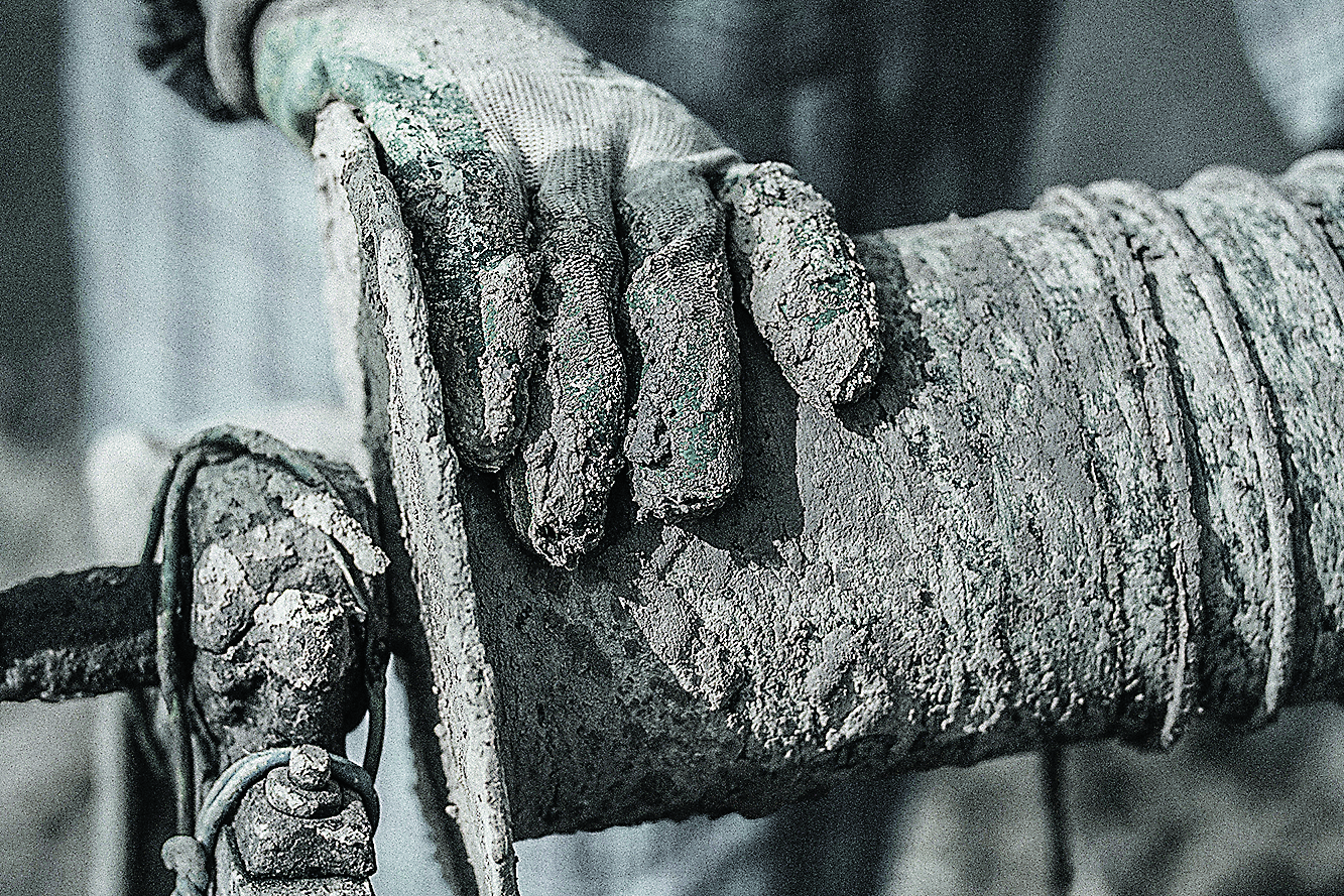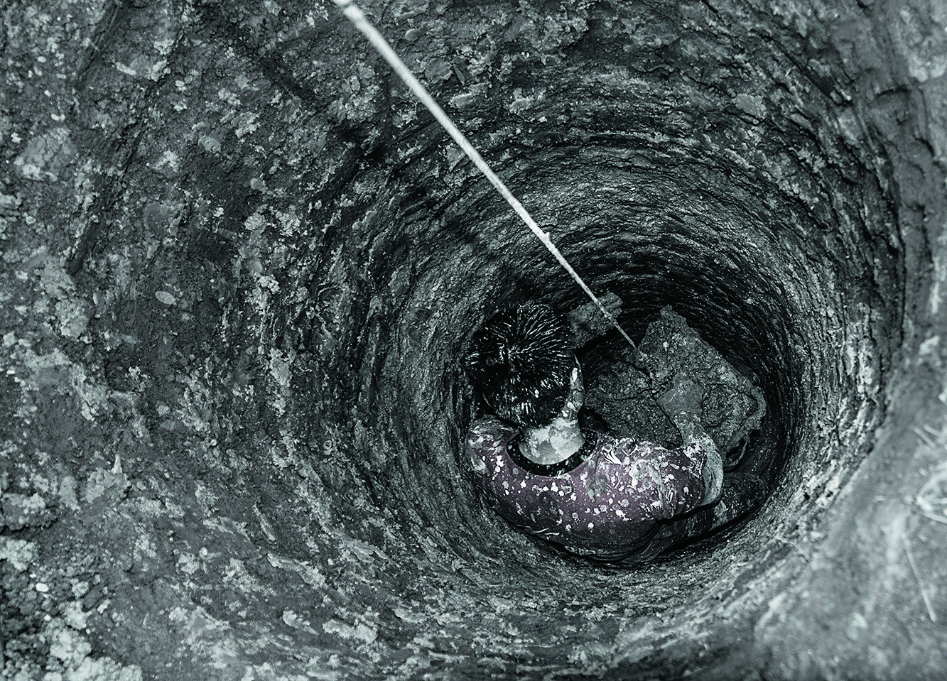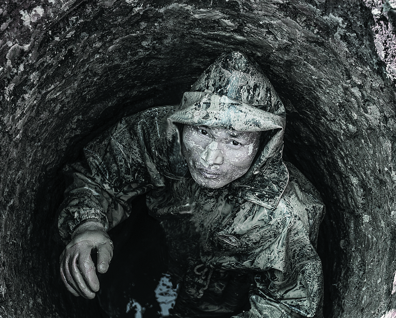 拍了几次后老觉得照片还差了点什么,后来得摄影老师指点,要我去更多地了解他们的生活,于是我利用他们中餐的时间,请他们把我吊下去感受,还跟着他们回到家里。几天的拍摄,我也成为了泥人,感受到了他们的生活不易。