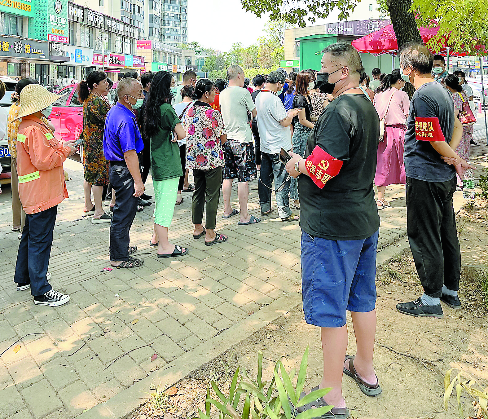 石峰区叫鸡岭社区核酸检测采样点,有志愿者在现场维持秩序,但居民排队间距略显过窄。 记者/刘平 摄