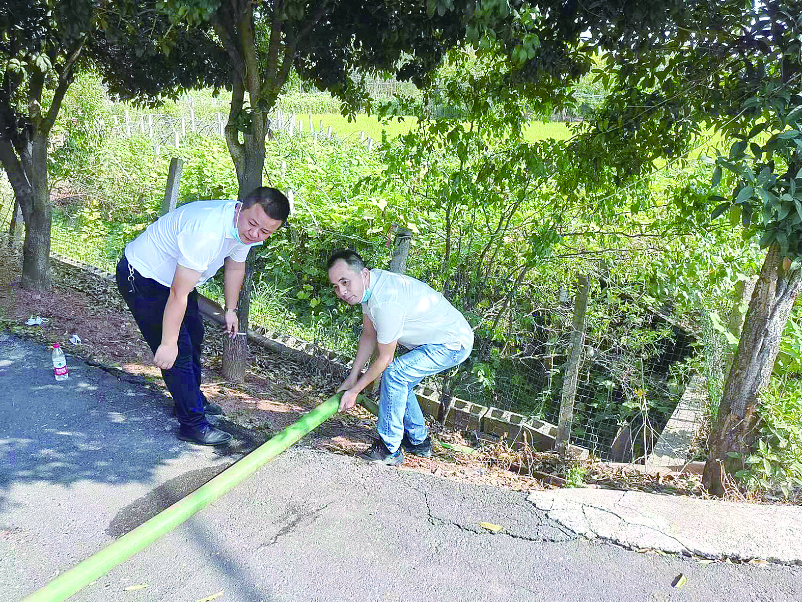 参与抗旱保灌溉,朱朝阳(右)在帮忙铺设引水管道。 (株洲日报全媒体记者/李军 摄)