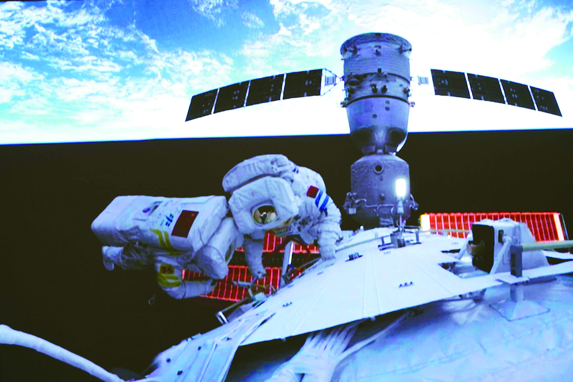 9月17日在北京航天飞行控制中心拍摄的神舟十四号航天员陈冬(右)、蔡旭哲同时在舱外操作的画面。 新华社发