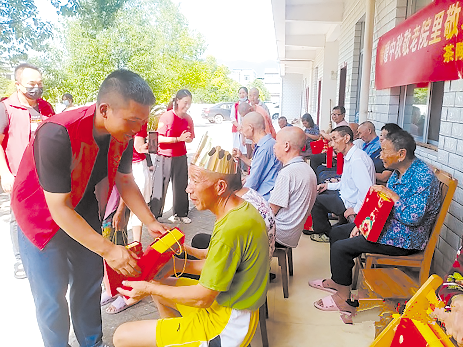 ▲志愿者为老人送上月饼