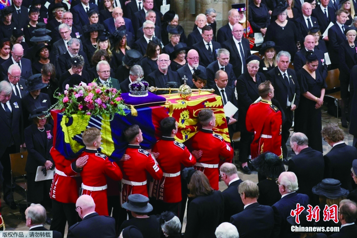 图为民众向英国女王伊丽莎白二世的灵柩致意默哀。