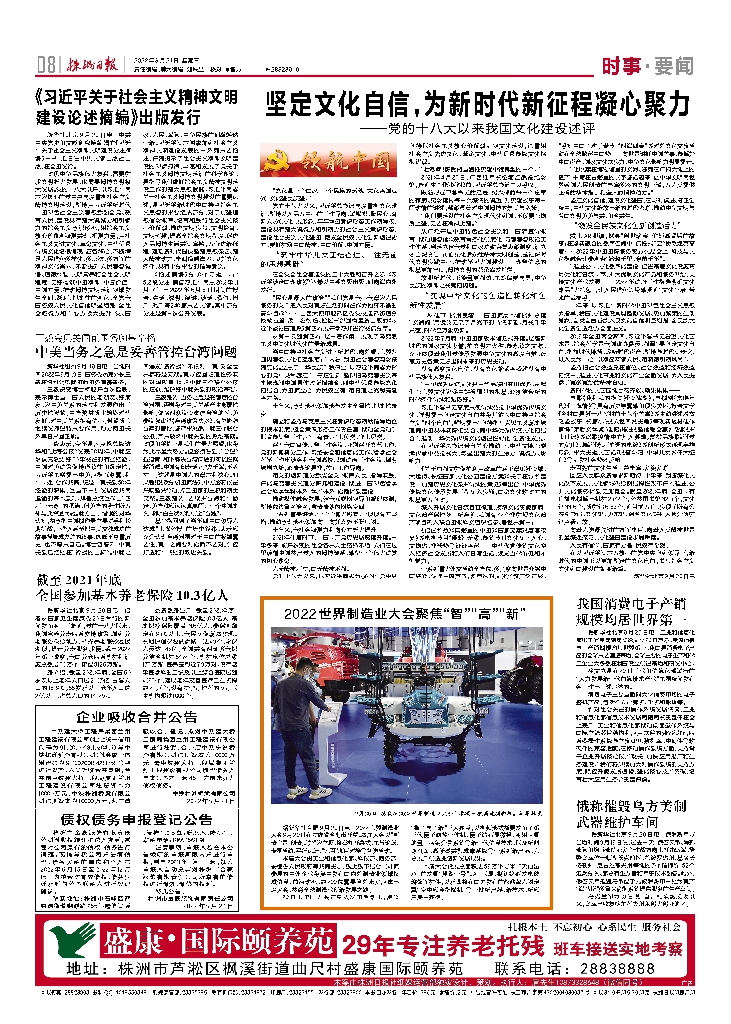 据新华社北京9月20日电 俄罗斯军方当地时间9月19日说,过去一天,俄空天军、导弹部队和炮兵部队在多个作战方向上打击乌军,摧毁乌军位于顿涅茨克地区、扎波罗热州、基洛沃格勒州、尼古拉耶夫州等地的7个指挥所、52个炮兵分队、部分有生力量和军事技术装备。此外,俄空天军摧毁乌军位于扎波罗热市一处为美产“海马斯”多管火箭炮系统提供服务的生产车间。