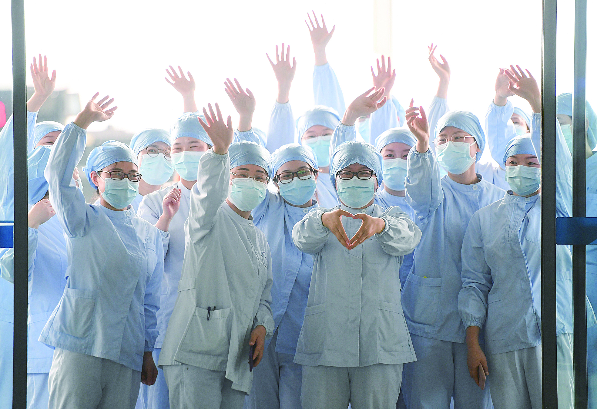 在武汉天河机场,湖北省武汉市第一医院医护人员为广东第14批援鄂医疗队送行(2020年3月23日摄)。 新华社发
