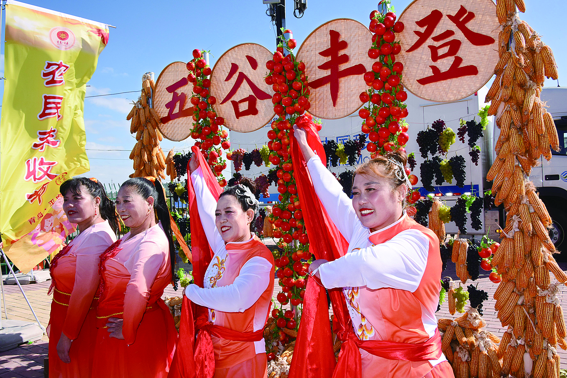 图为参加丰收节文艺演出的村民合影。 新华社记者 李紫恒 摄
