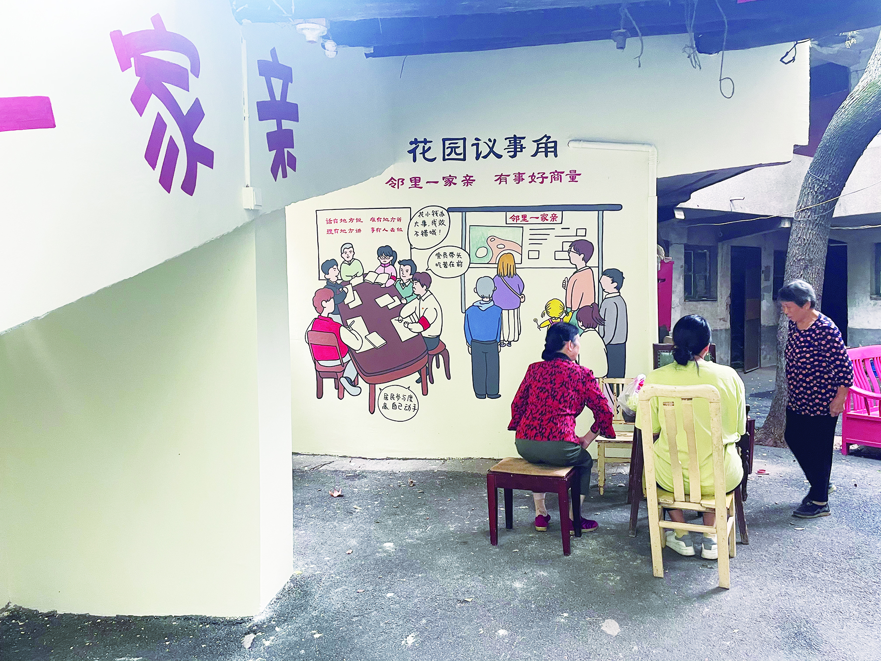 湘华41栋建于20世纪80年代,经过岁月的冲刷,部分墙体已经老旧剥落。为解决与群众利益密切相关的难点热点问题,赵家冲社区建湘党支部提出美化小区公共区域的规划。在充分征求居民意见后,得到了大家的积极支持。“你们什么时候画,让停在附近的车挪开,这样你们好上手。”得益于居民们的高度配合,从确定图案到完成所有墙绘,只花了一个星期不到的时间。如今,淡黄色的墙上,写着“邻里一家亲”,公共区域一角设置成“花园议事角”,墙上议事漫画写着“有事好商量”,墙下有居民休闲桌椅。