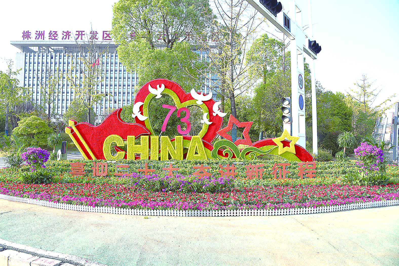 国庆将至,株洲经开区街头花团锦簇,营造出浓厚的节日氛围。图为该区管委会前坪一侧的喜迎二十大鲜花造型。