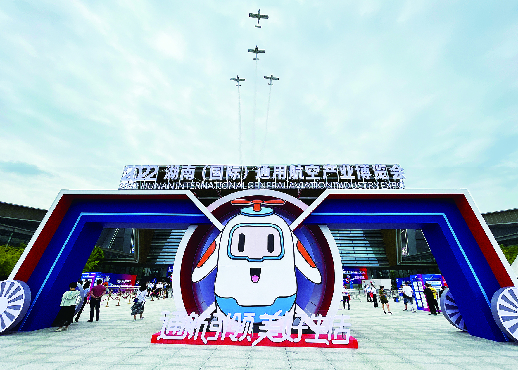 株洲造阿若拉飞机编队飞越博览会展区上空。 株洲日报全媒体记者/廖威 摄