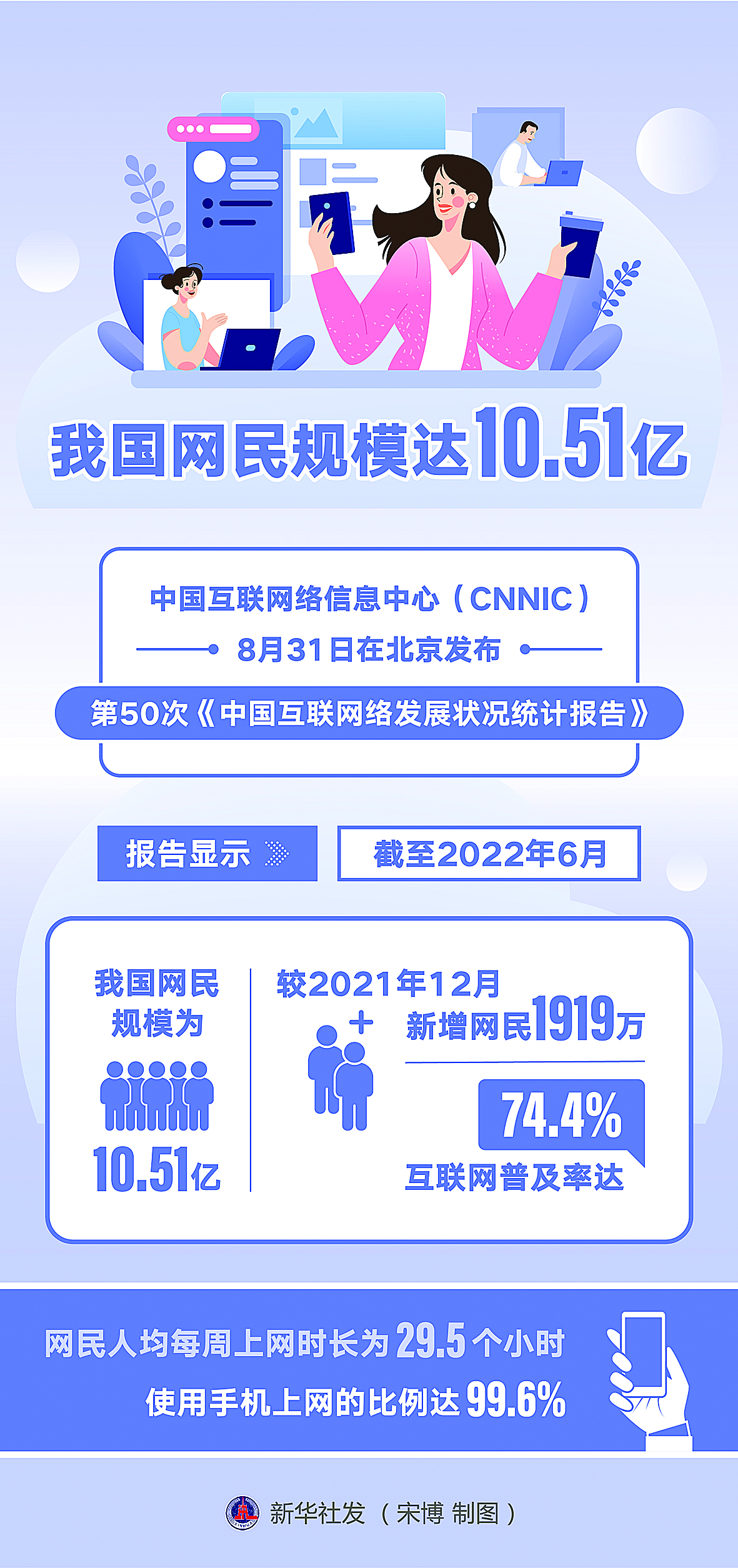 8月31日,中国互联网络信息中心(CNNIC)在京发布第50次《中国互联网络发展状况统计报告》。报告显示,截至2022年6月,我国网民规模为10.51亿,互联网普及率达74.4%;互联网基础建设全面覆盖,实现“县县通5G、村村通宽带”。