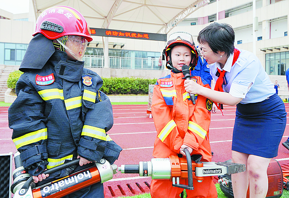 当天,消防人员还将消防车开进操场,现场讲解各种装备的用途,面对无人机、液压破拆工具等器材,学生们充满好奇,不时发出阵阵的感叹。“消防员真辛苦,这个衣服又厚又重,穿着太热了,我都走不动啦!”现场,学生们通过试穿救援服、电绝缘服、防化服等,体会到消防员的不易。
