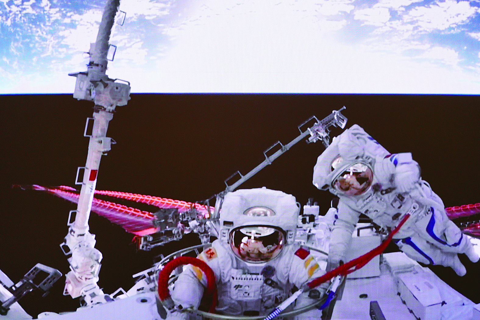 ▲9月2日在北京航天飞行控制中心拍摄的神舟十四号航天员刘洋(左)结束出舱任务正在返回的画面。