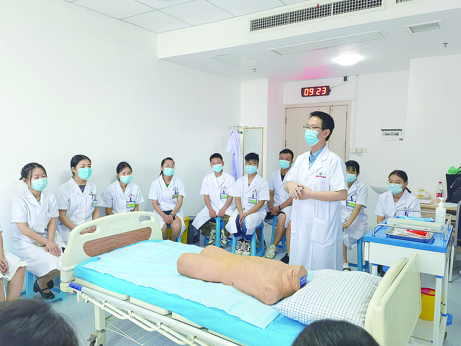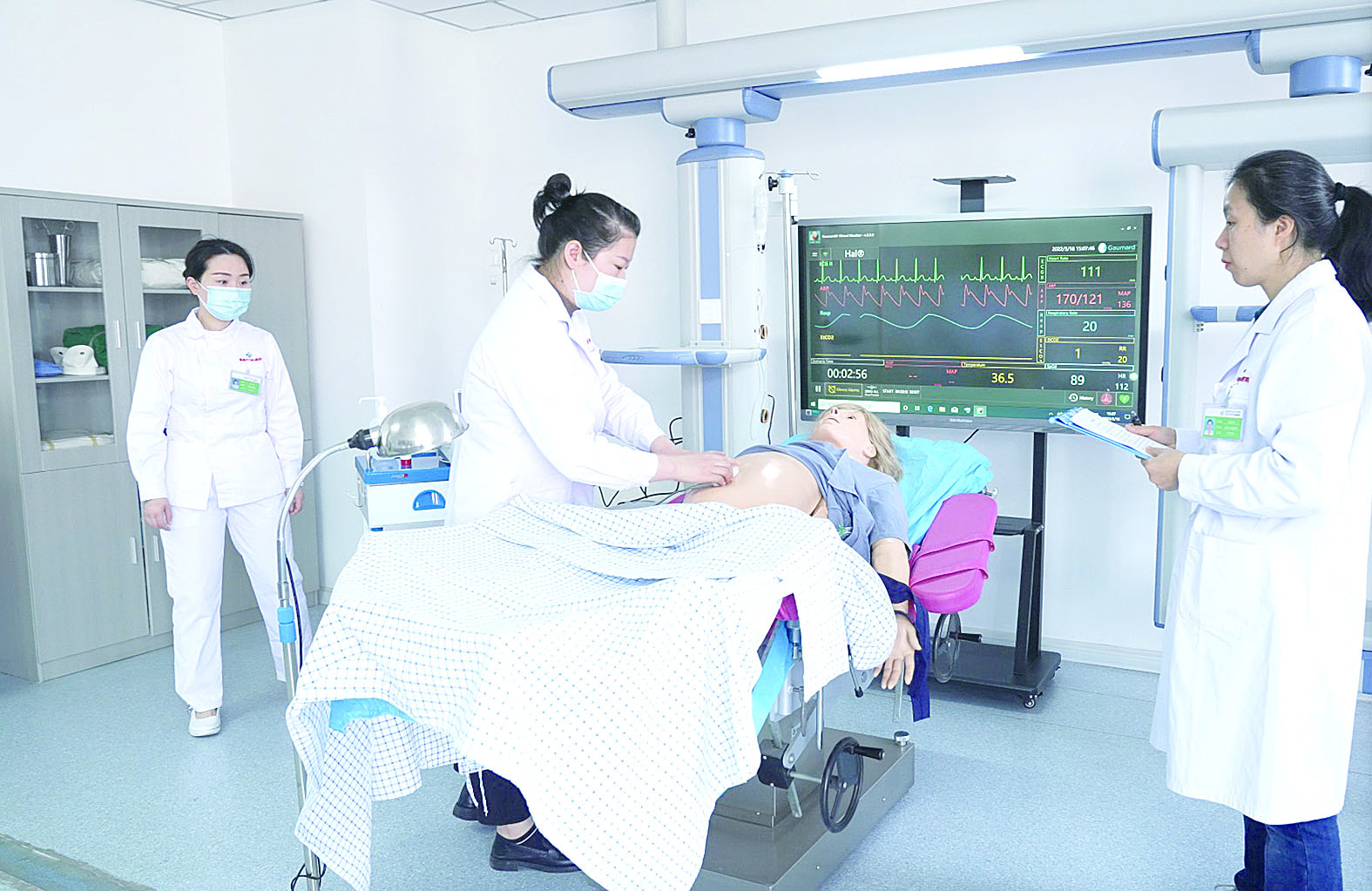 学员在模拟产房利用高端综合模拟人开展培训。