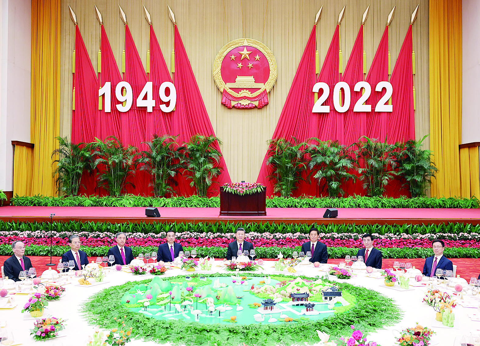 人民大会堂宴会厅华灯璀璨、鲜花绽放,洋溢着喜庆热烈的节日气氛。主席台上方,庄严的国徽高悬,“1949-2022”的大字年号在鲜艳的红旗映衬下格外醒目。