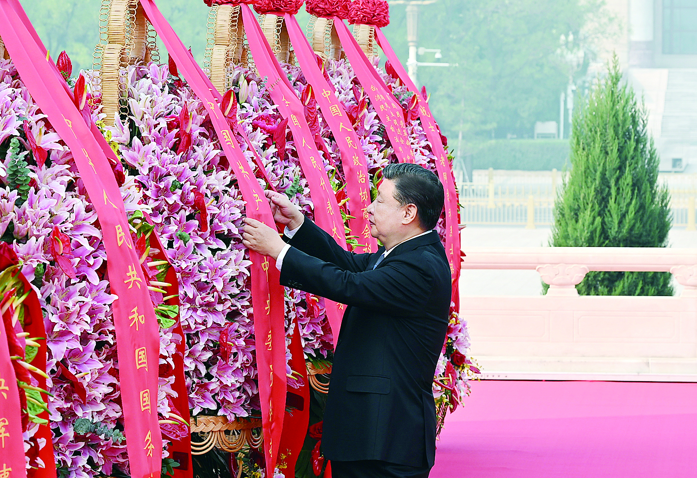 9月30日上午,党和国家领导人习近平、李克强、栗战书、汪洋、王沪宁、赵乐际、韩正、王岐山等来到北京天安门广场,出席烈士纪念日向人民英雄敬献花篮仪式。这是习近平整理花篮上的缎带。 新华社记者 殷博古 摄