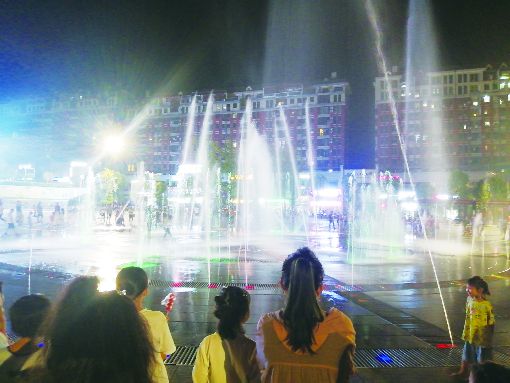 国庆期间,炎陵县城的体育广场在晚上开放音乐喷泉,给老区人民和外地度假的游客带来假日欢乐。