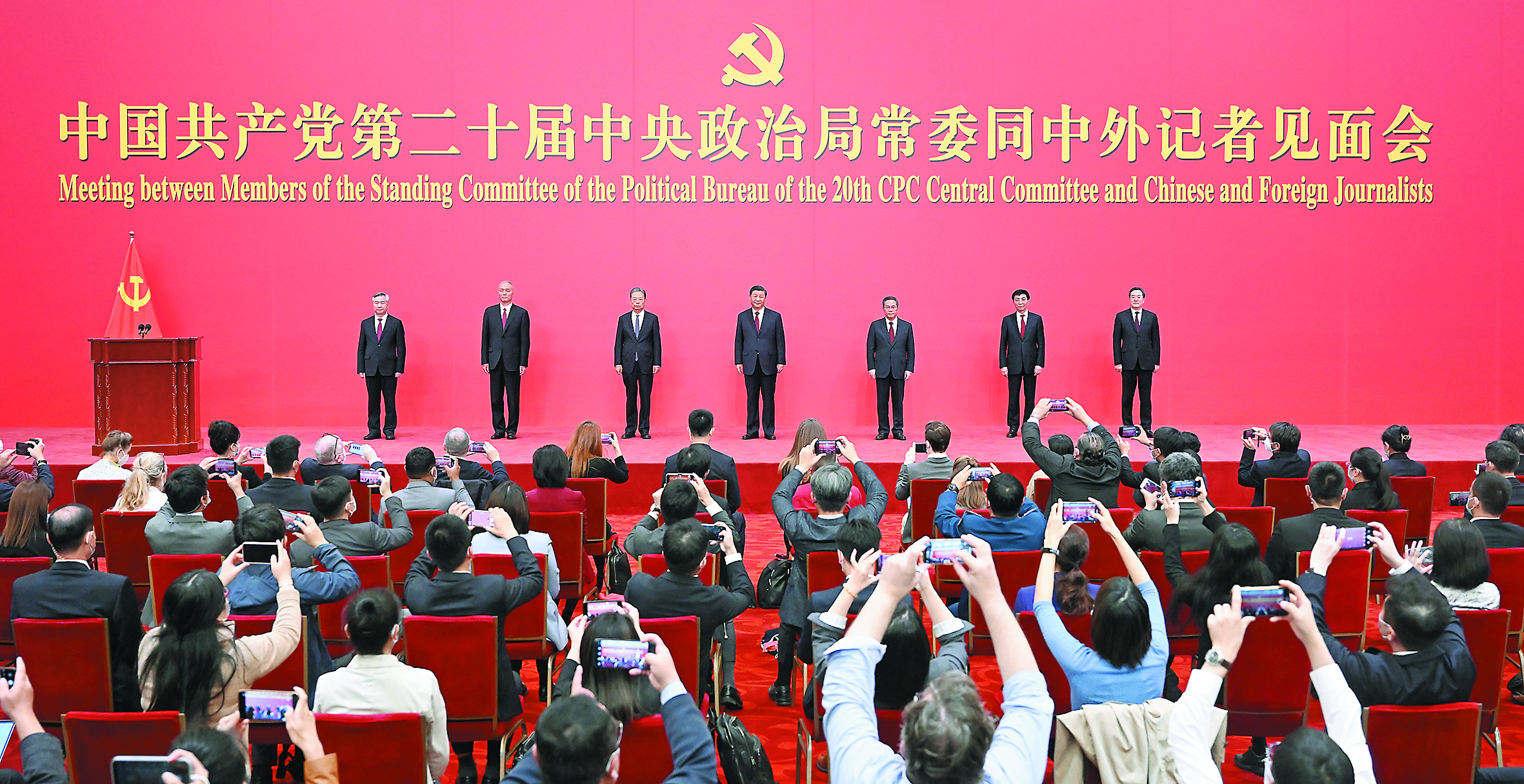 10月23日,刚刚在中国共产党第二十届中央委员会第一次全体会议上当选的中共中央总书记习近平和中共中央政治局常委李强、赵乐际、王沪宁、蔡奇、丁薛祥、李希在北京人民大会堂同采访中共二十大的中外记者亲切见面。 新华社记者 /申宏 摄
