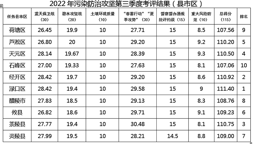 株洲日报讯(全媒体记者/廖明 通讯员/崔林) 根据市委、市政府指示要求和市生环委相关文件精神,市生态环境保护委员会办公室组织开展了2022年第三季度污染防治攻坚战考评,经市生环委研究同意,现将考核评估结果通报如下:
