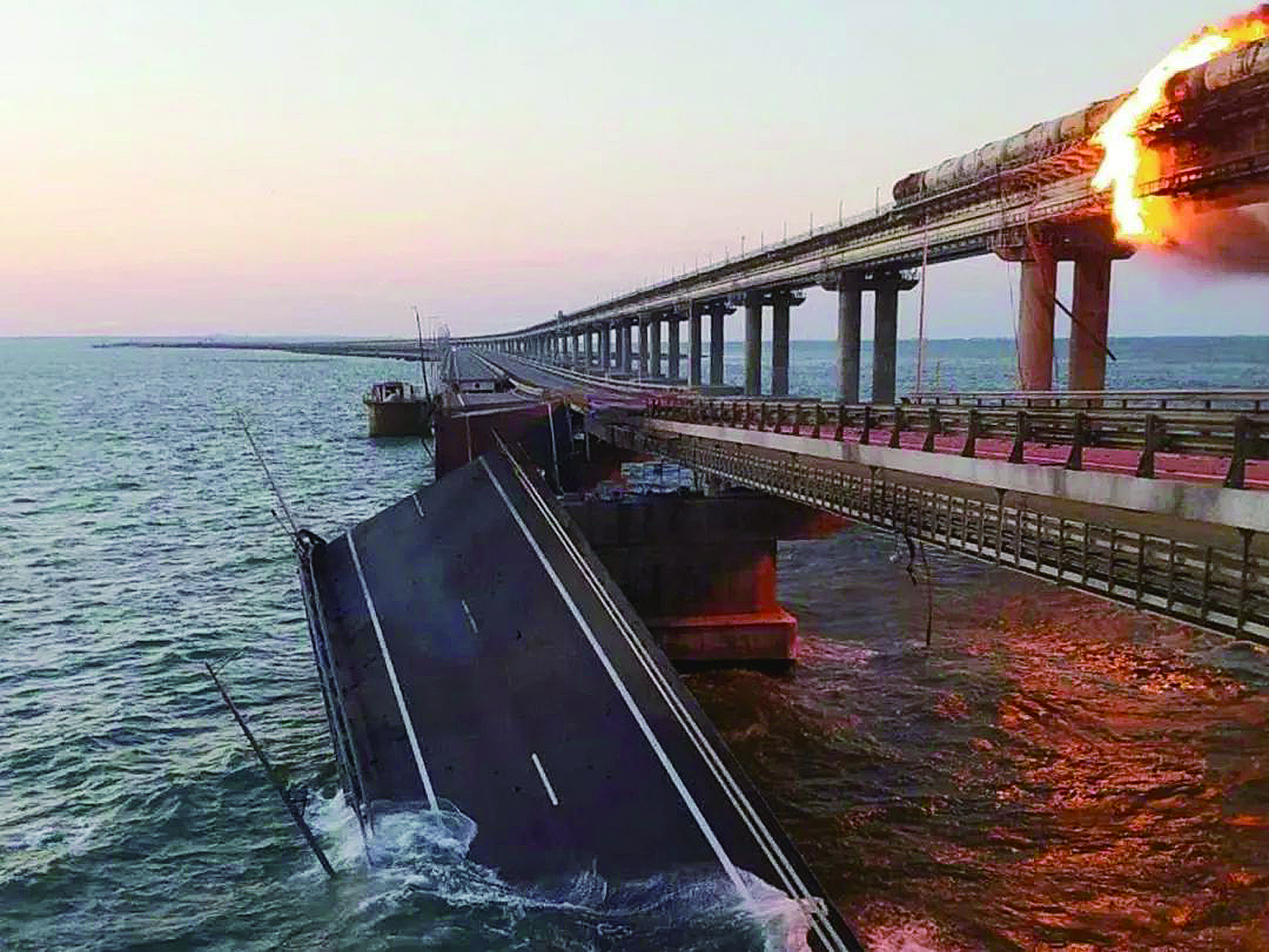 据俄罗斯国家反恐委员会通报,克里米亚大桥公路桥上一辆卡车发生爆炸,导致与公路桥并行的铁路桥上一货运列车上七个油罐被点燃;公路桥部分路段受损坍塌。
