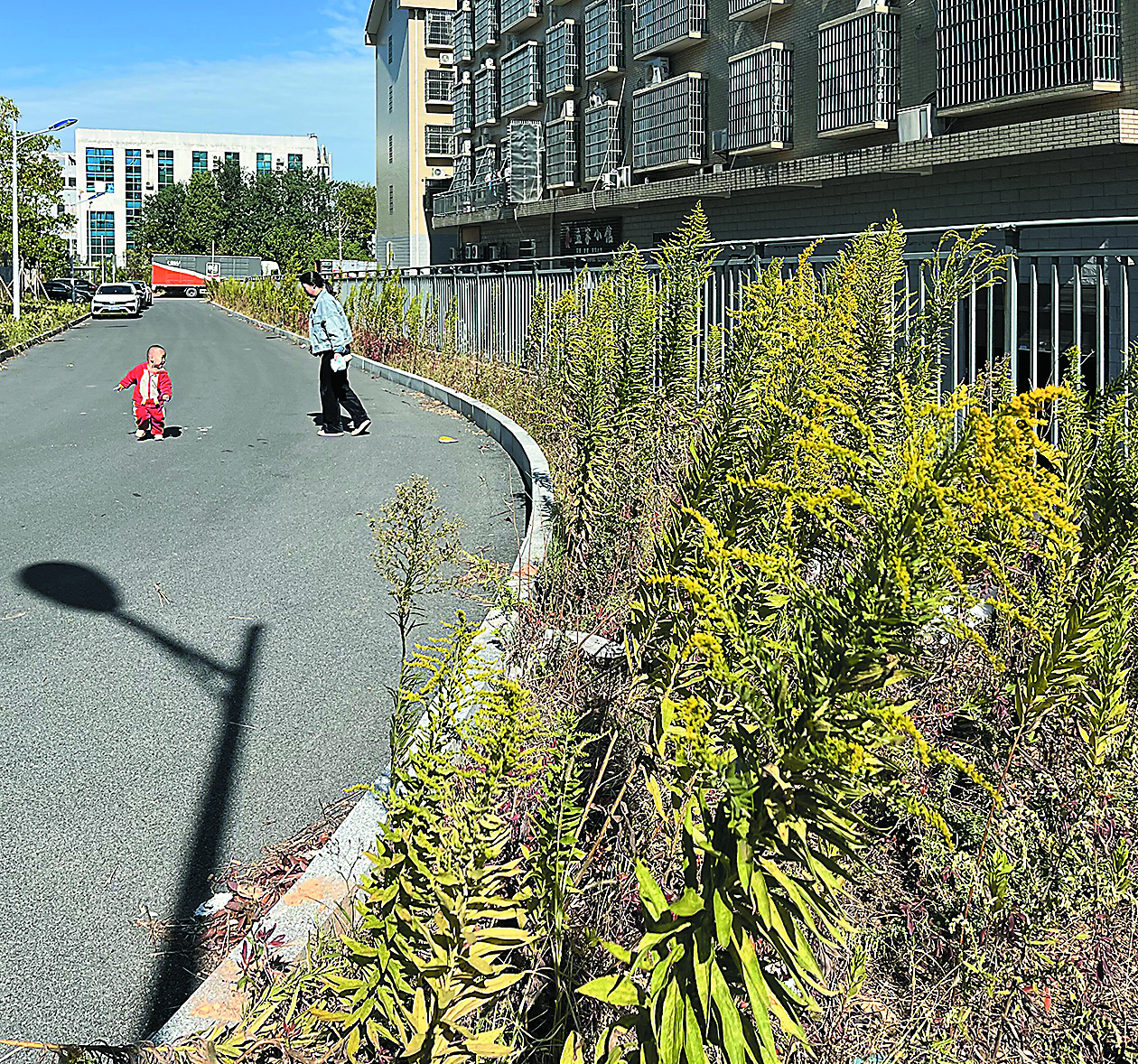 在株洲莞深智造技术装备商贸城,一条绿化带隔着围栏与天台小区为邻。该绿化带几乎长满“一枝黄花”,很多植株已开出金黄色的花絮。