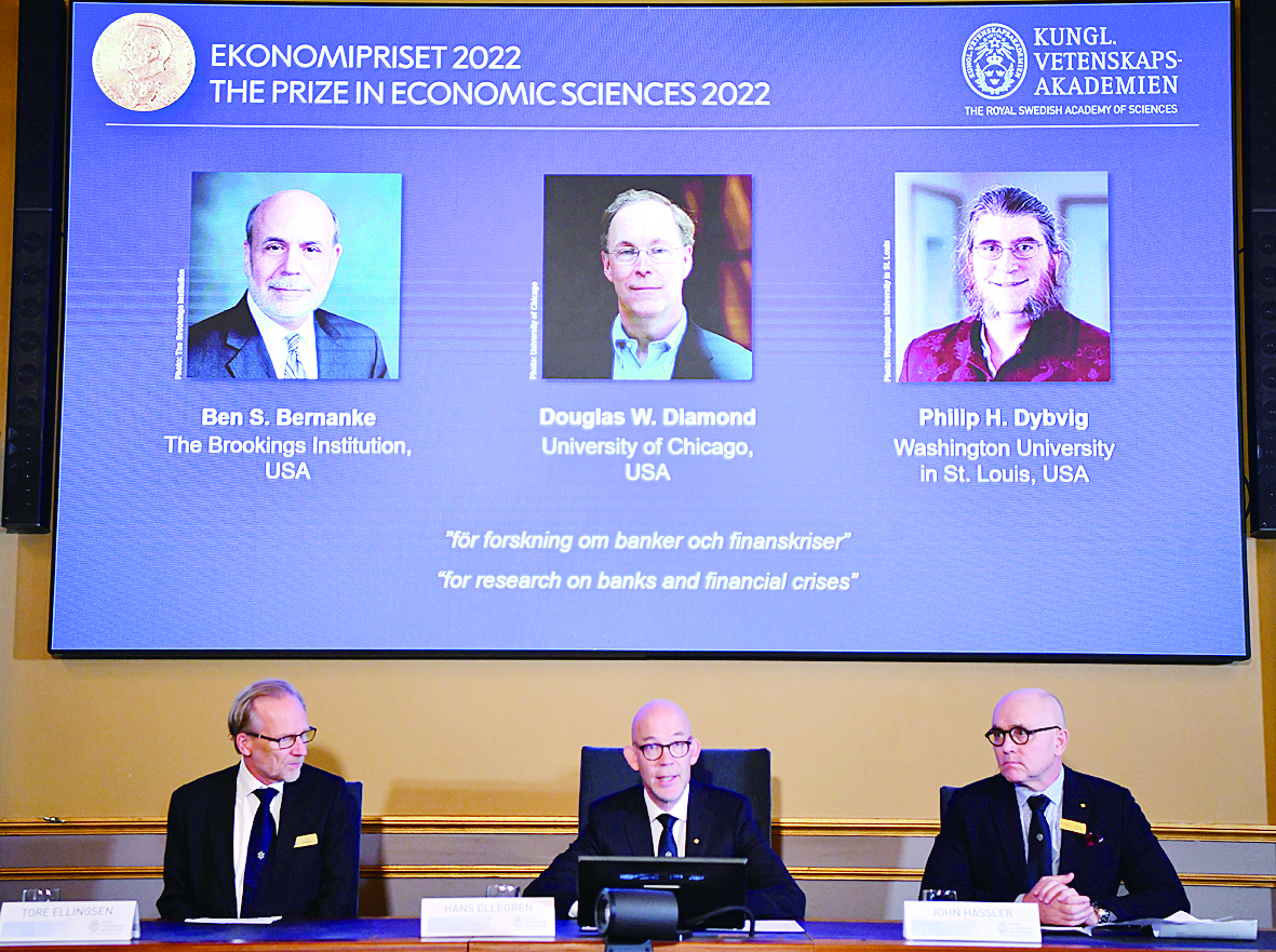 新华社斯德哥尔摩10月10日电 瑞典皇家科学院10日在斯德哥尔摩宣布,将2022年诺贝尔经济学奖授予经济学家本·伯南克、道格拉斯·戴蒙德和菲利普·迪布维格,以表彰他们在银行与金融危机研究领域的突出贡献。