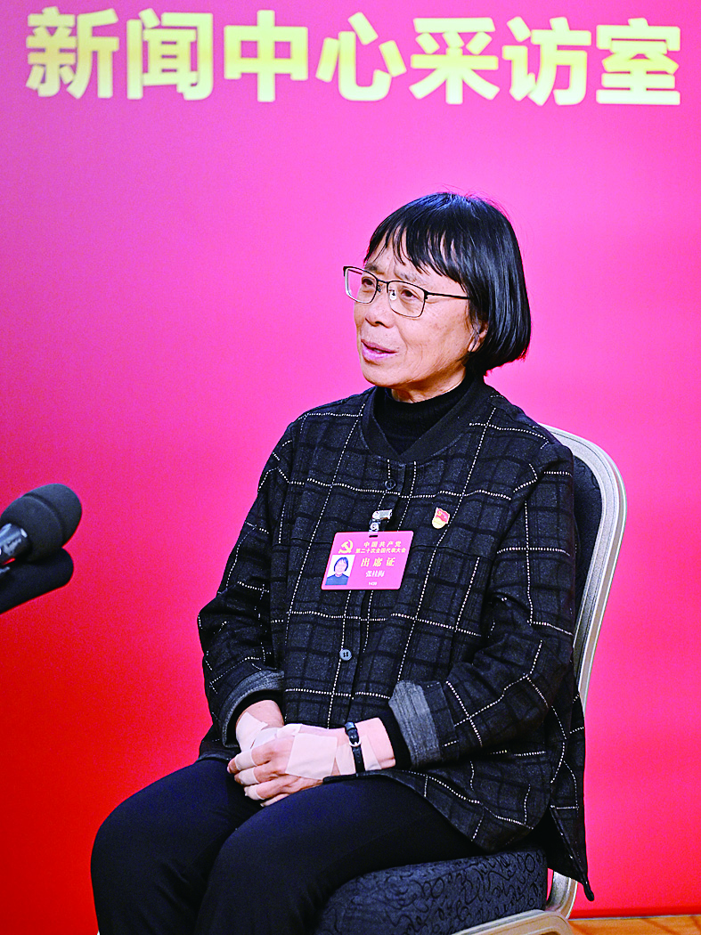 10月16日,张桂梅代表接受记者采访。 新华社记者 陈益宸 摄