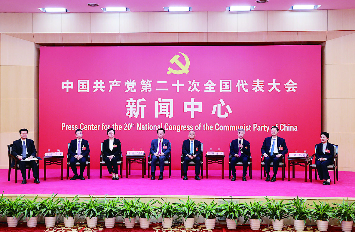 10月19日,中国共产党第二十次全国代表大会新闻中心举行集体采访。重庆、四川、贵州、云南、西藏、陕西、甘肃代表团新闻发言人出席,介绍代表团学习讨论二十大报告情况,并回答记者提问。 新华社记者 张玉薇 摄