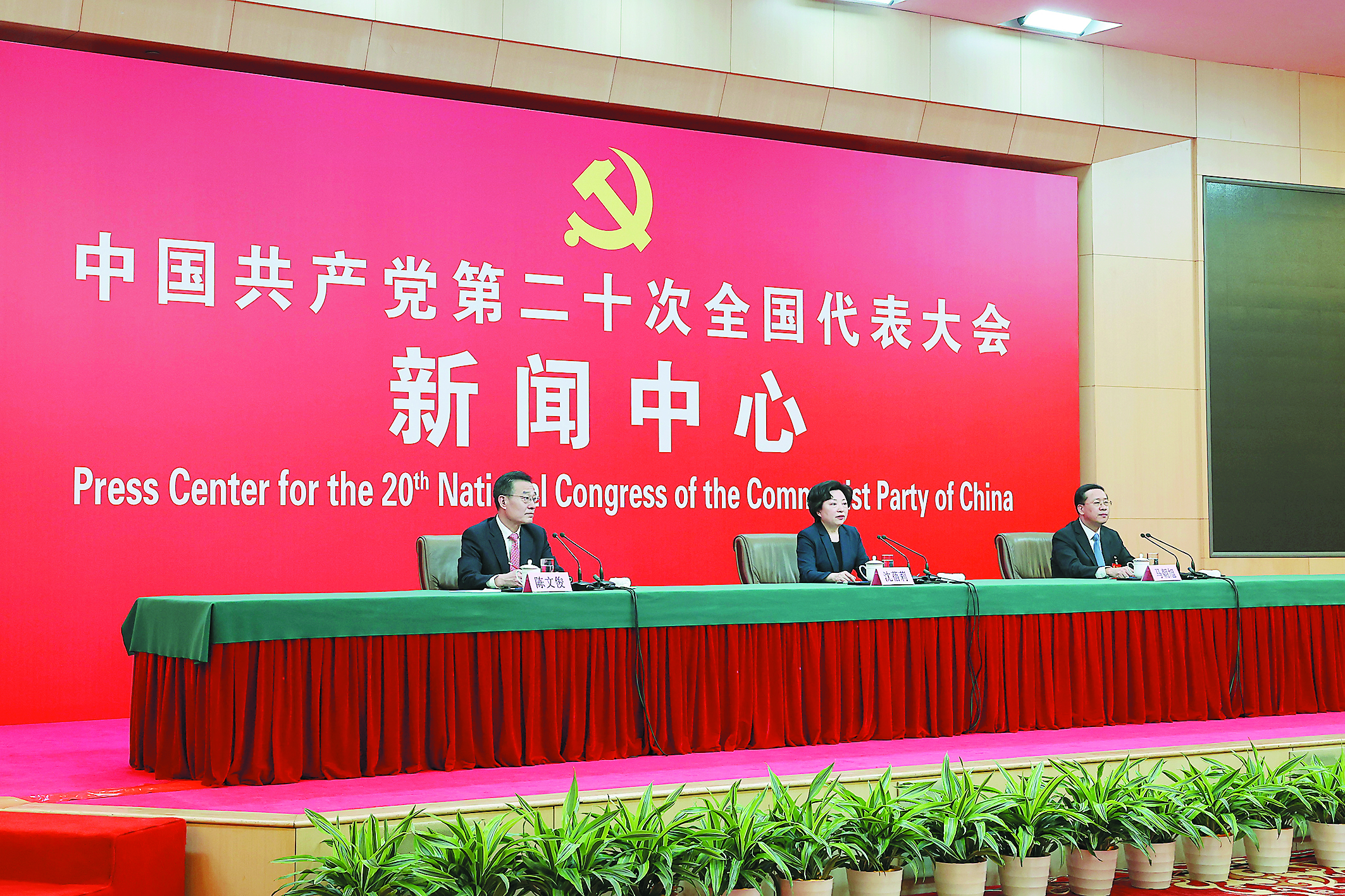 10月20日,中国共产党第二十次全国代表大会新闻中心举行记者招待会。中央对外联络部副部长沈蓓莉,外交部党委委员、副部长马朝旭围绕“习近平外交思想指引中国特色大国外交开拓前行”主题与记者交流。 新华社记者 张玉薇 摄